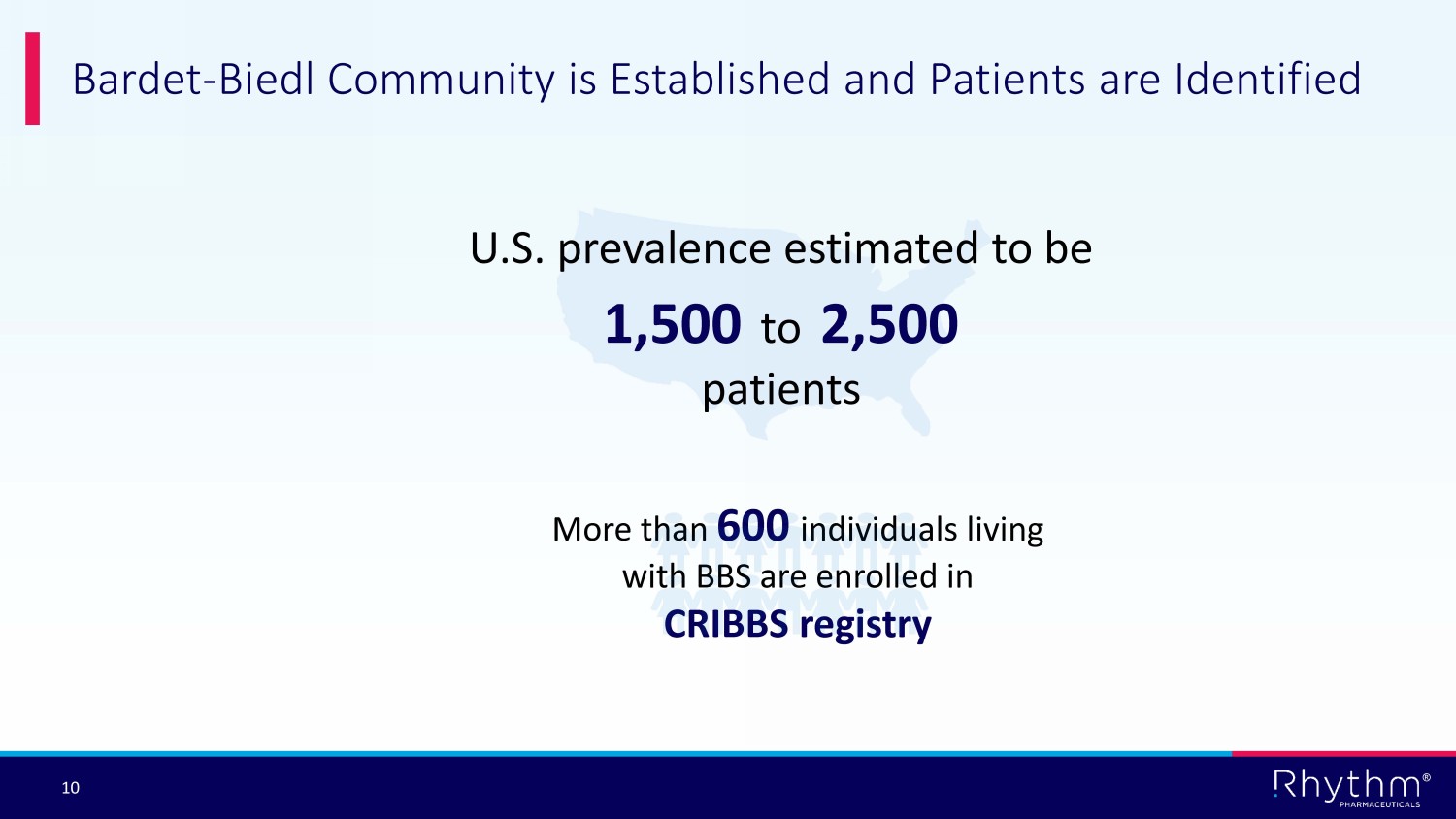 ® 10 Bardet - Biedl Community is Established and Patients are Identified U.S. prevalence estimated to be 1,500 to 2,500 patients More than 600 individuals living with BBS are enrolled in CRIBBS registry