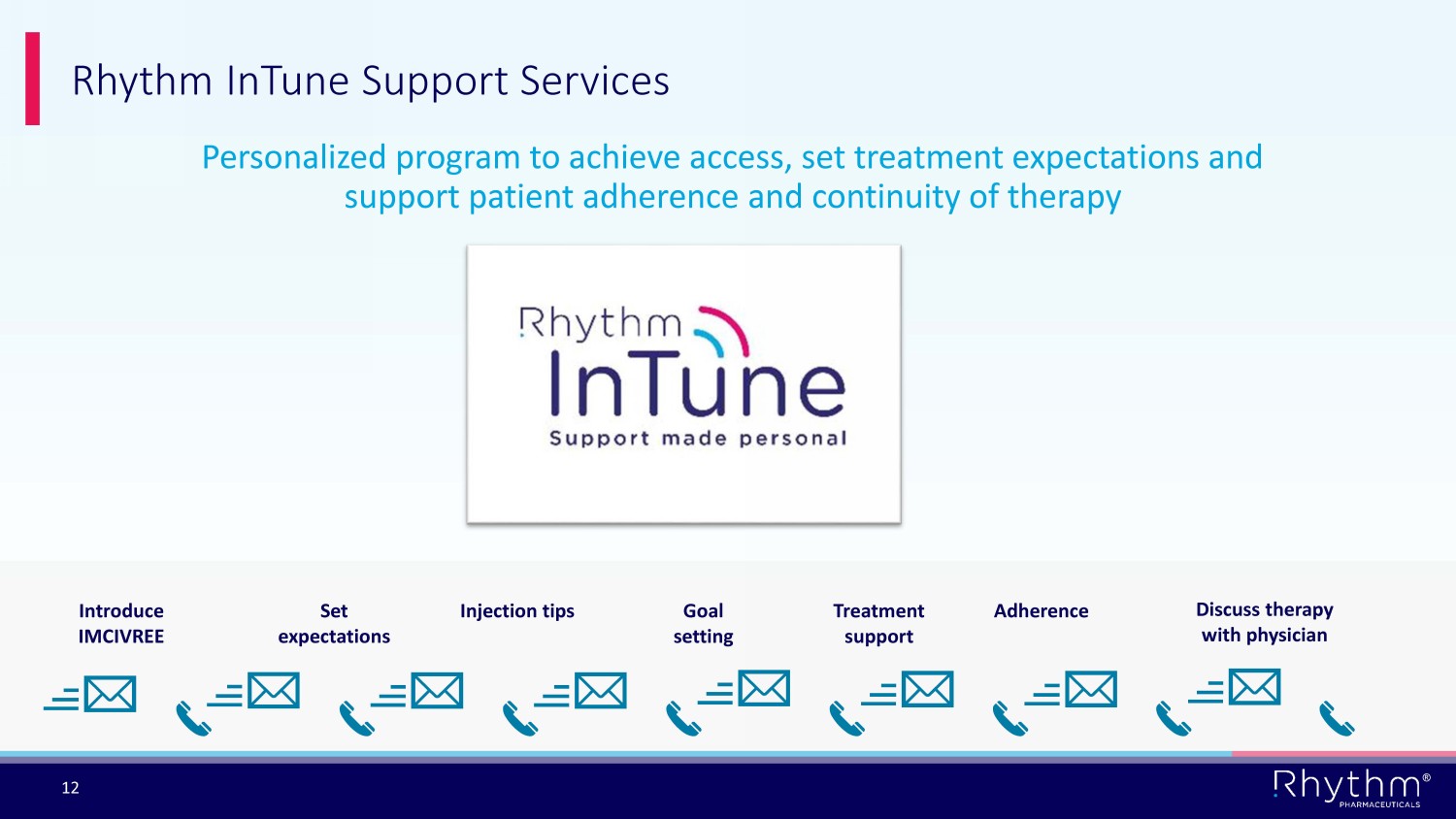 ® 12 Personalized program to achieve access, set treatment expectations and support patient adherence and continuity of therapy Rhythm InTune Support Services Introduce IMCIVREE Set expectations Discuss therapy with physician Treatment support Injection tips Adherence Goal setting