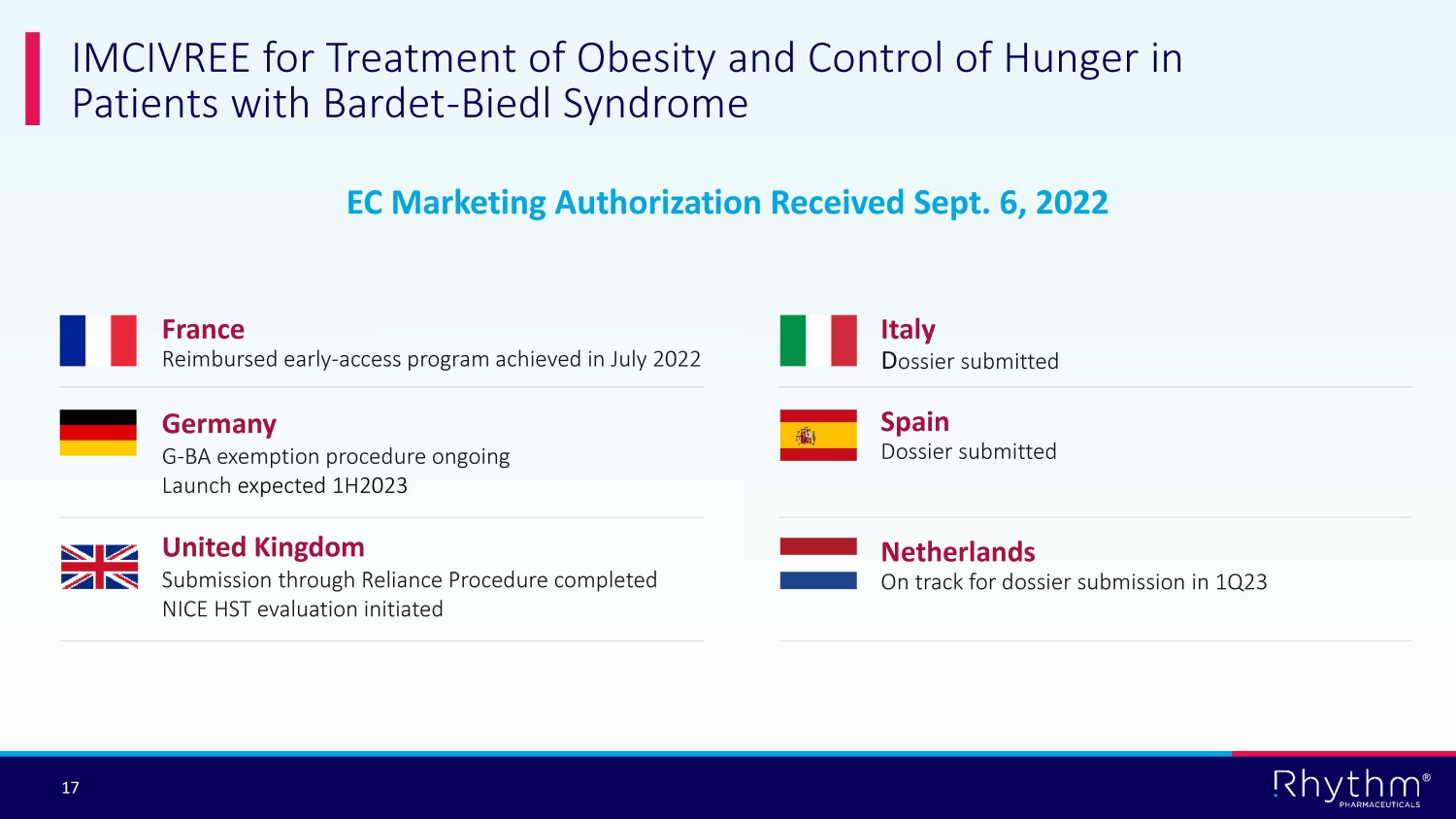 ® 16 Global Launch Underway for POMC, PCSK1 and LEPR Deficiency x United Kingdom Commercial launch in October 2022 following UK NICE recommendation x Germany Launched, first sales in 2Q22 following exemption from G - BA lifestyle drug exclusion list x France Reimbursed since March 2022 via early access program x Italy Commercial launch in 4Q 2022 x Netherlands Commercial launch in 4Q 2022 x Austria Named patient sales x Turkey Named patient sales x Argentina Early access