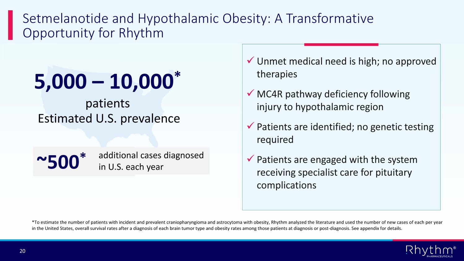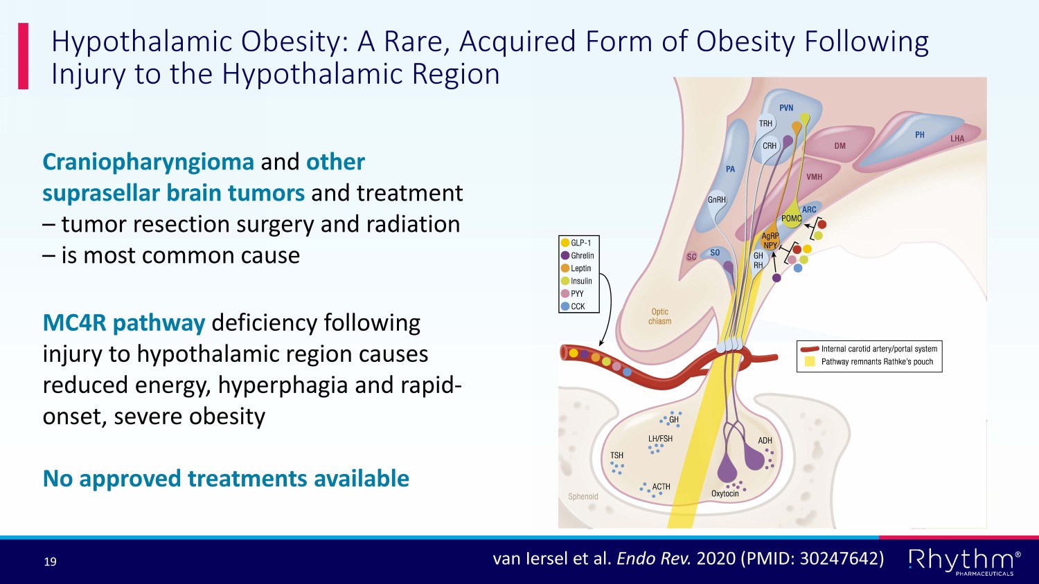 ® 19 Hypothalamic Obesity: A Rare, Acquired Form of Obesity Following Injury to the Hypothalamic Region Craniopharyngioma and other suprasellar brain tumors and treatment – tumor resection surgery and radiation – is most common cause MC4R pathway deficiency following injury to hypothalamic region causes reduced energy, hyperphagia and rapid - onset, severe obesity No approved treatments available van Iersel et al. Endo Rev. 2020 (PMID: 30247642)