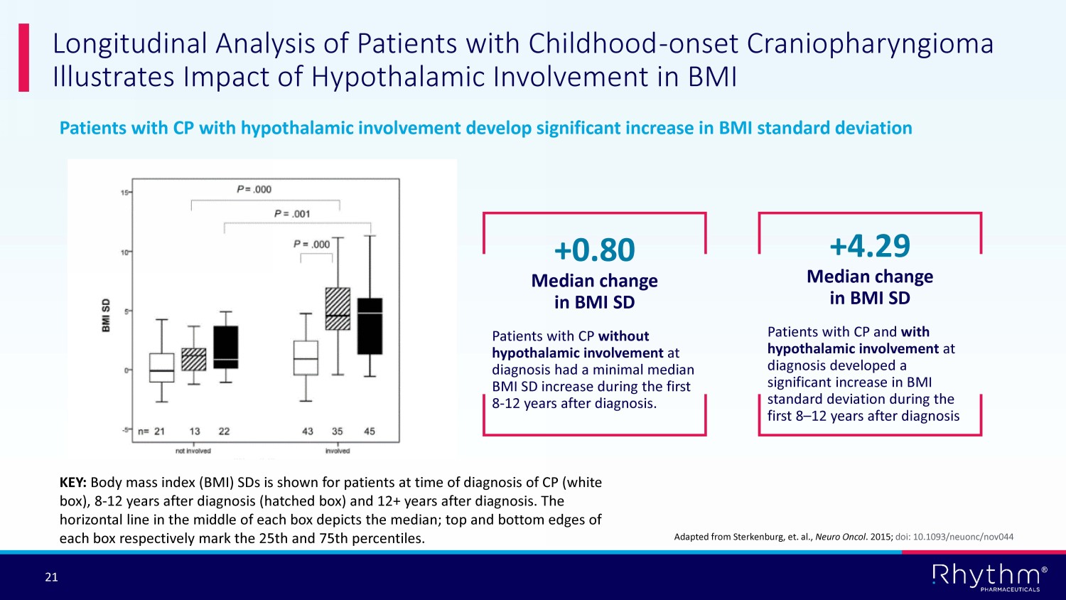 ® 20 Setmelanotide and Hypothalamic Obesity: A Transformative Opportunity for Rhythm x Unmet medical need is high; no approved therapies x MC4R pathway deficiency following injury to hypothalamic region x Patients are identified; no genetic testing required x Patients are engaged with the system receiving specialist care for pituitary complications 5,000 – 10,000 * patients Estimated U.S. prevalence ~500 * additional cases diagnosed in U.S. each year *To estimate the number of patients with incident and prevalent craniopharyngioma and astrocytoma with obesity, Rhythm analyz ed the literature and used the number of new cases of each per year in the United States, overall survival rates after a diagnosis of each brain tumor type and obesity rates among those patient s a t diagnosis or post - diagnosis. See appendix for details.