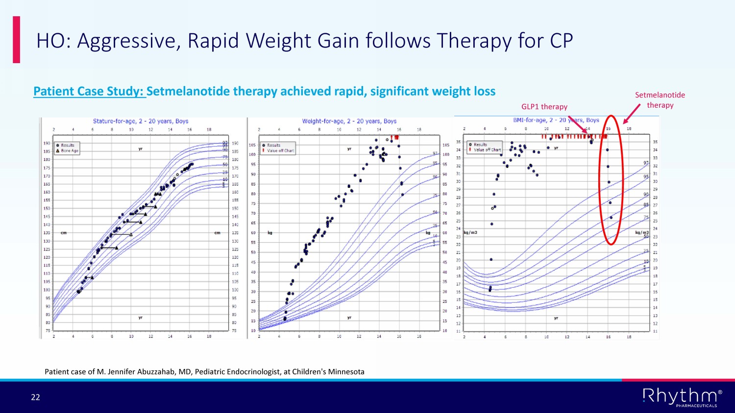 ® 22 HO: Aggressive, Rapid Weight Gain follows Therapy for CP Setmelanotide therapy GLP1 therapy Patient Case Study: Setmelanotide therapy achieved rapid, significant weight loss Patient case of M. Jennifer Abuzzahab, MD, Pediatric Endocrinologist, at Children's Minnesota