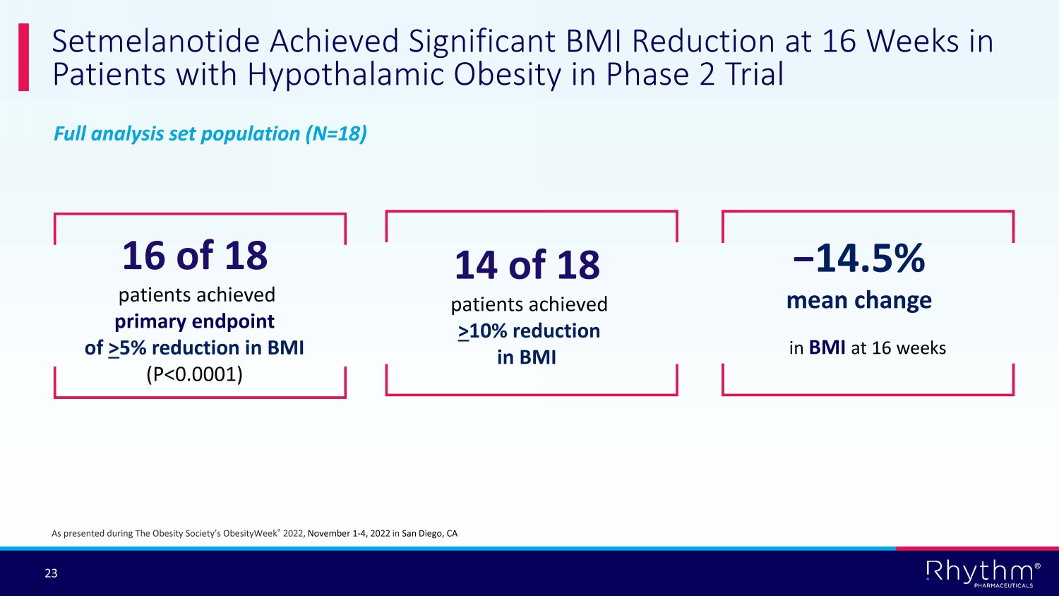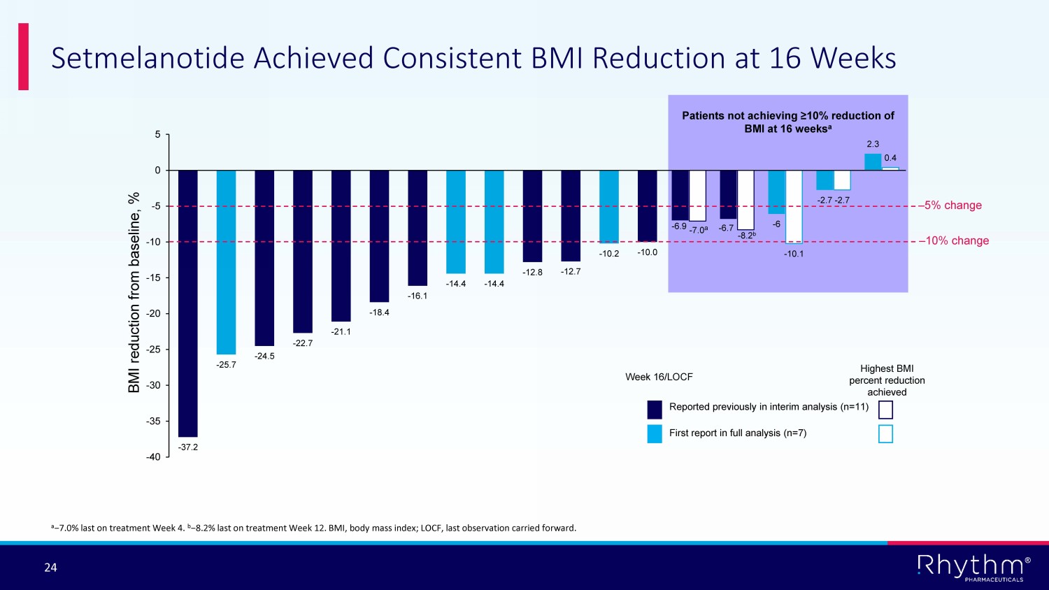 ® 23 Setmelanotide Achieved Significant BMI Reduction at 16 Weeks in Patients with Hypothalamic Obesity in Phase 2 Trial As presented during The Obesity Society’s ObesityWeek ® 2022, November 1 - 4, 2022 in San Diego, CA Full analysis set population (N=18) − 14.5% mean change in BMI at 16 weeks 16 of 18 patients achieved primary endpoint of > 5% reduction in BMI (P<0.0001) 14 of 18 patients achieved > 10% reduction in BMI