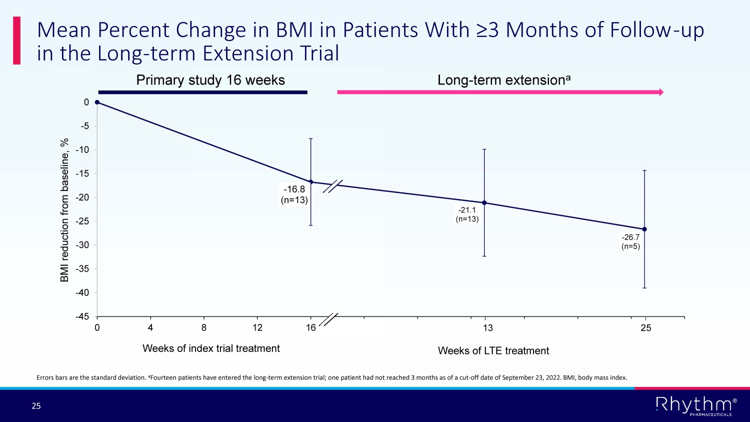 ® 25 Mean Percent Change in BMI in Patients With ≥3 Months of Follow - up in the Long - term Extension Trial - 16.8 (n=13) - 21.1 (n=13) - 26.7 (n=5) -45 -40 -35 -30 -25 -20 -15 -10 -5 0 0 4 8 12 16 20 24 28 32 36 40 44 BMI reduction from baseline, % Weeks of index trial treatment Primary study 16 weeks Long - term extension a 13 25 Weeks of LTE treatment Errors bars are the standard deviation. a Fourteen patients have entered the long - term extension trial; one patient had not reached 3 months as of a cut - off date of Septe mber 23, 2022. BMI, body mass index.
