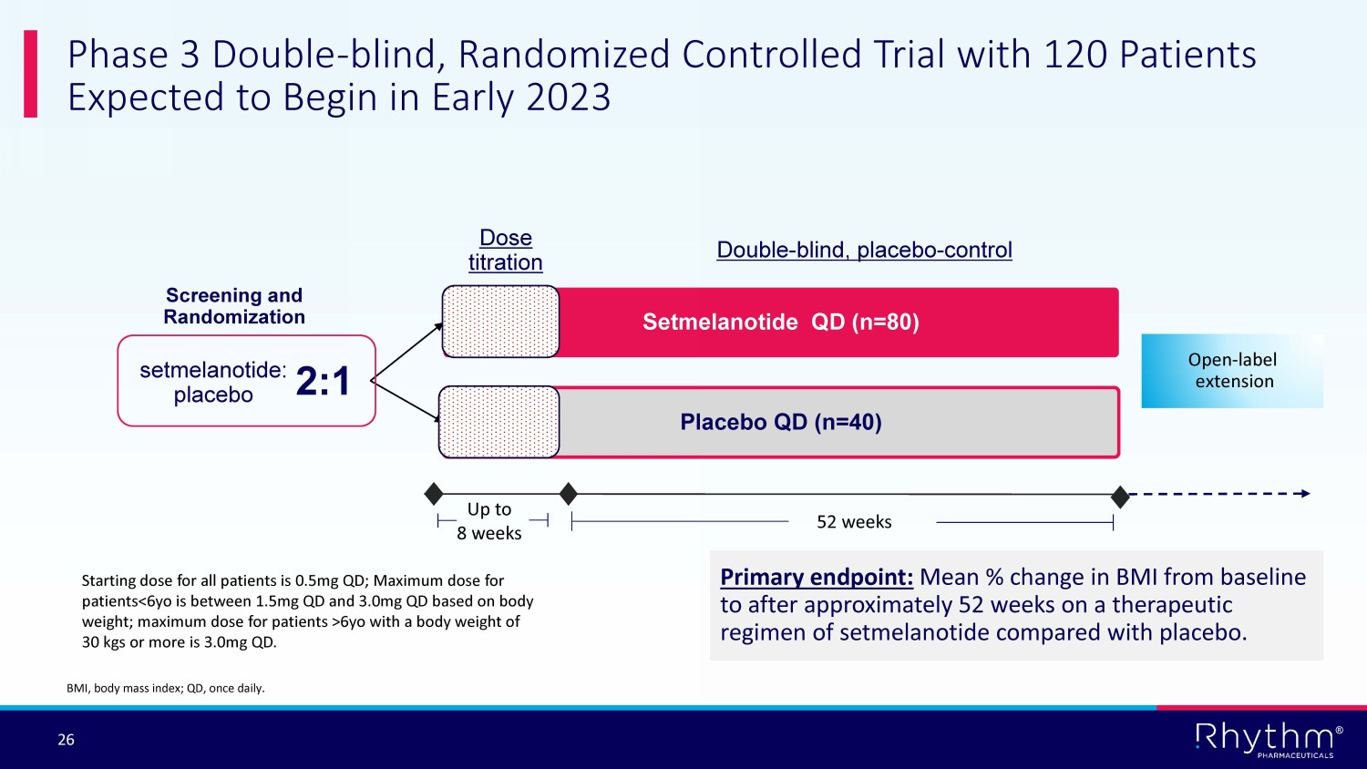 ® 26 Phase 3 Double - blind, Randomized Controlled Trial with 120 Patients Expected to Begin in Early 2023 BMI, body mass index; QD, once daily. Setmelanotide QD (n=80) Double - blind, placebo - control Placebo QD (n=40) Up to 8 weeks 52 weeks Dose titration Primary endpoint: Mean % change in BMI from baseline to after approximately 52 weeks on a therapeutic regimen of setmelanotide compared with placebo. Screening and Randomization Open - label extension 2:1 setmelanotide: placebo Starting dose for all patients is 0.5mg QD; Maximum dose for patients<6yo is between 1.5mg QD and 3.0mg QD based on body weight; maximum dose for patients >6yo with a body weight of 30 kgs or more is 3.0mg QD.