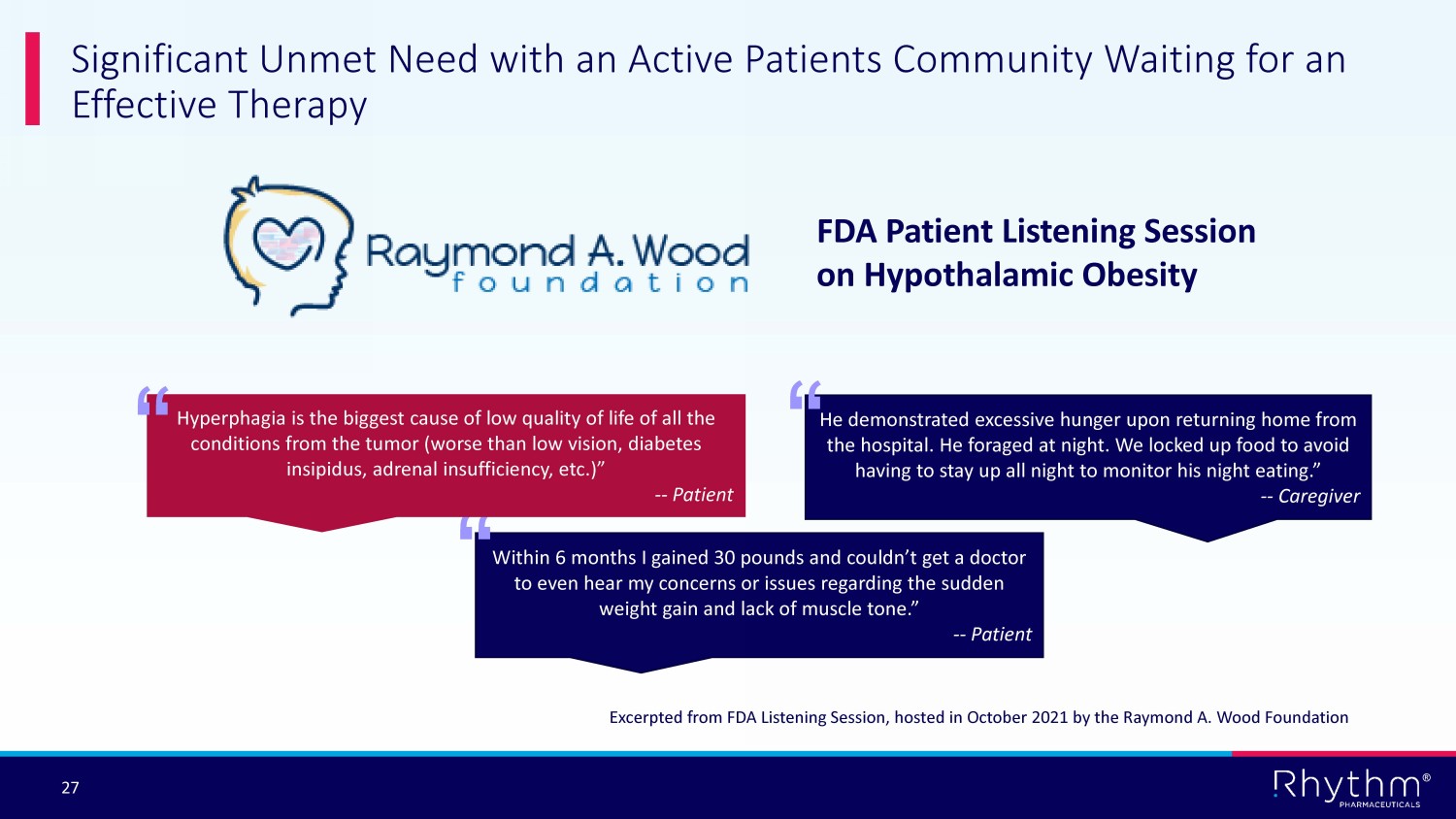 ® 27 Significant Unmet Need with an Active Patients Community Waiting for an Effective Therapy He demonstrated excessive hunger upon returning home from the hospital. He foraged at night. We locked up food to avoid having to stay up all night to monitor his night eating.” -- Caregiver “ Excerpted from FDA Listening Session, hosted in October 2021 by the Raymond A. Wood Foundation Within 6 months I gained 30 pounds and couldn’t get a doctor to even hear my concerns or issues regarding the sudden weight gain and lack of muscle tone.” -- Patient “ Hyperphagia is the biggest cause of low quality of life of all the conditions from the tumor (worse than low vision, diabetes insipidus, adrenal insufficiency, etc.)” -- Patient “ FDA Patient Listening Session on Hypothalamic Obesity