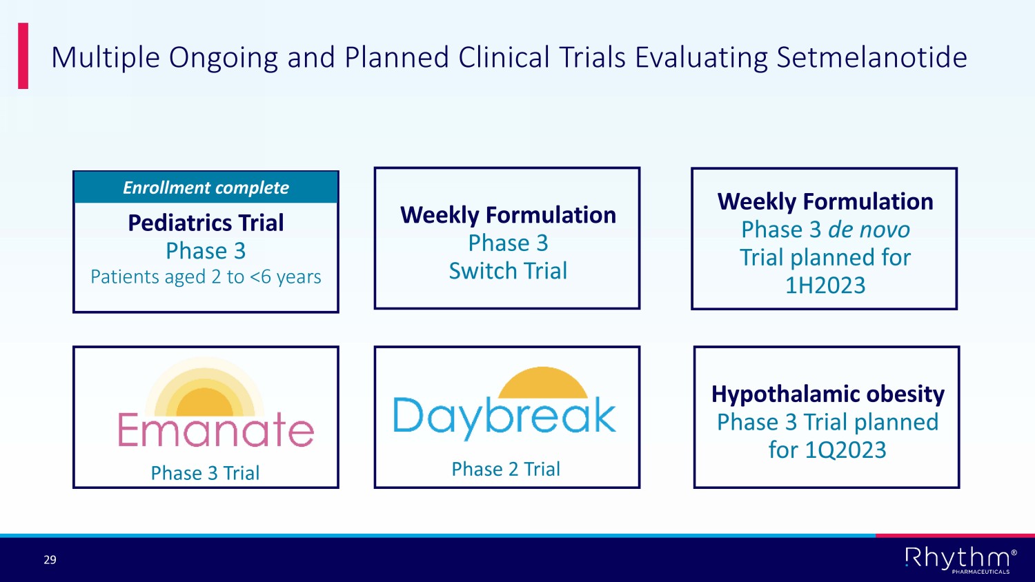 ® 29 Multiple Ongoing and Planned Clinical Trials Evaluating Setmelanotide Weekly Formulation Phase 3 Switch Trial Pediatrics Trial Phase 3 Patients aged 2 to <6 years Phase 2 Trial Phase 3 Trial Enrollment complete Hypothalamic obesity Phase 3 Trial planned for 1Q2023 Weekly Formulation Phase 3 de novo Trial planned for 1H2023