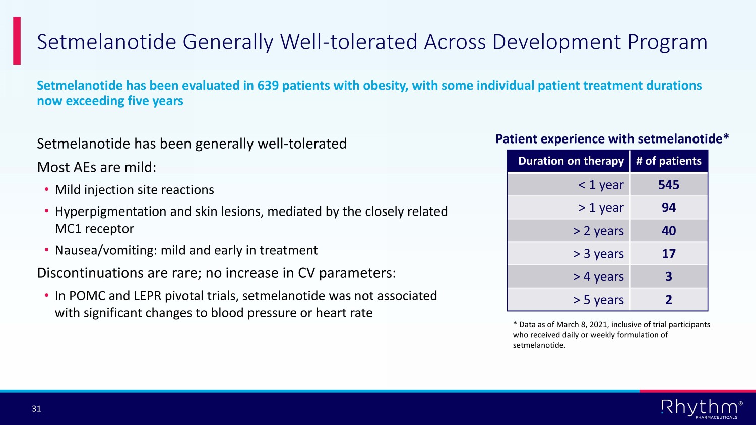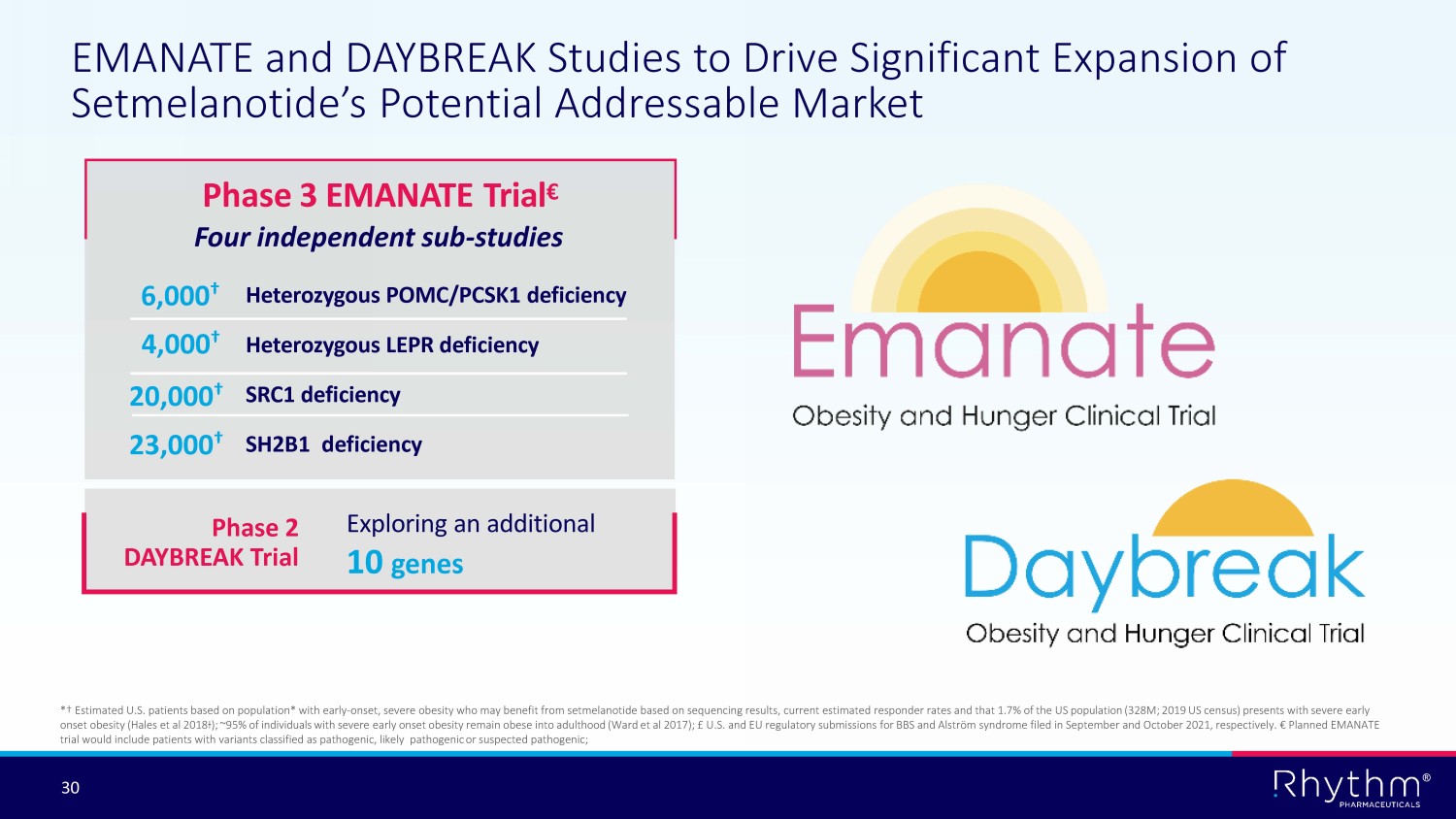 ® 30 Phase 3 EMANATE Trial € EMANATE and DAYBREAK Studies to Drive Significant Expansion of Setmelanotide’s Potential Addressable Market *† Estimated U.S. patients based on population* with early - onset, severe obesity who may benefit from setmelanotide based on seq uencing results, current estimated responder rates and that 1.7% of the US population (328M; 2019 US census) presents with severe early onset obesity (Hales et al 2018Ɨ); ~95% of individuals with severe early onset obesity remain obese into adulthood (Ward et al 2017); £ U.S. and EU regulatory submissions for BBS and Alström syndrome filed in September and October 2021, respectively. € Planned EMANATE trial would include patients with variants classified as pathogenic, likely pathogenic or suspected pathogenic; 20,000 † Heterozygous POMC/PCSK1 deficiency Heterozygous LEPR deficiency SRC1 deficiency SH2B1 deficienc y Exploring an additional 10 genes 23,000 † 4,000 † Phase 2 DAYBREAK Trial 6,000 † Four independent sub - studies