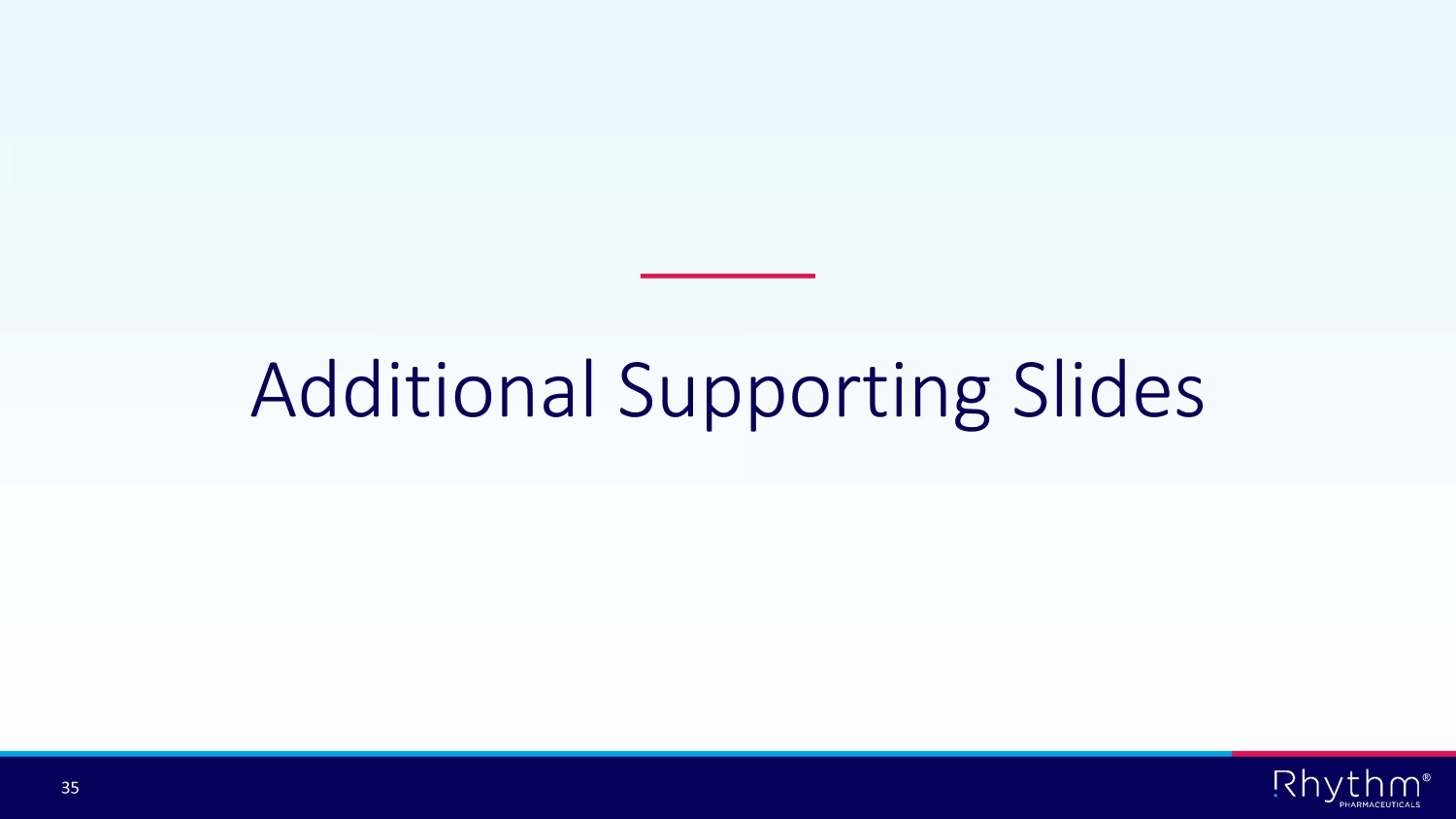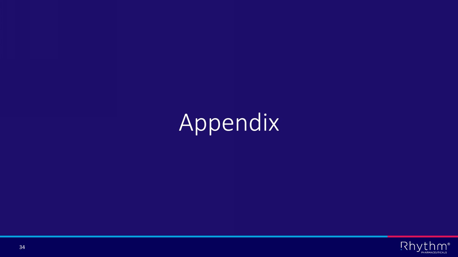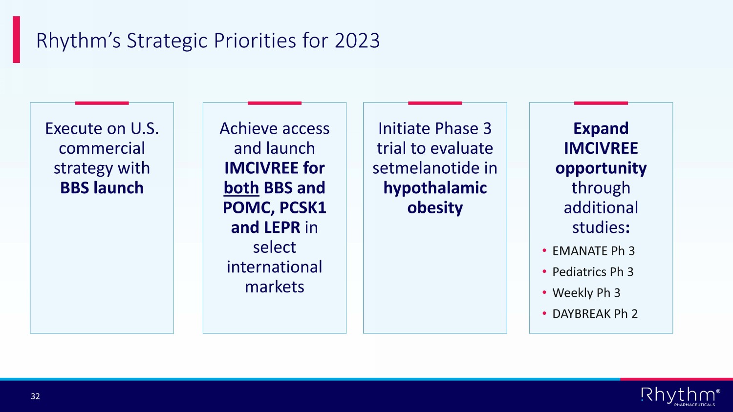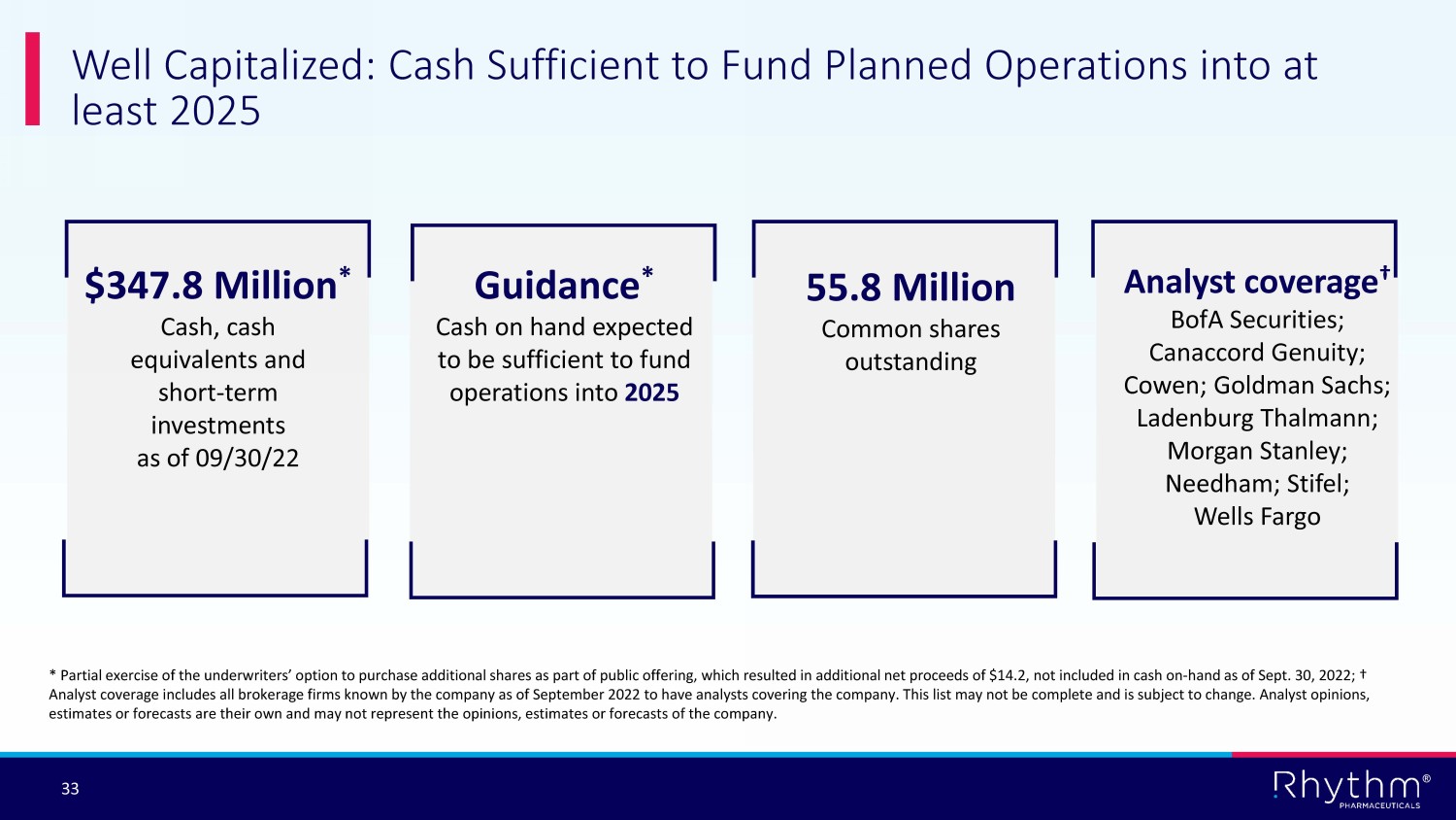 ® 32 Rhythm’s Strategic Priorities for 2023 Execute on U.S. commercial strategy with BBS launch Achieve access and launch IMCIVREE for both BBS and POMC, PCSK1 and LEPR in select international markets Expand IMCIVREE opportunity through additional studies : • EMANATE Ph 3 • Pediatrics Ph 3 • Weekly Ph 3 • DAYBREAK Ph 2 Initiate Phase 3 trial to evaluate setmelanotide in hypothalamic obesity