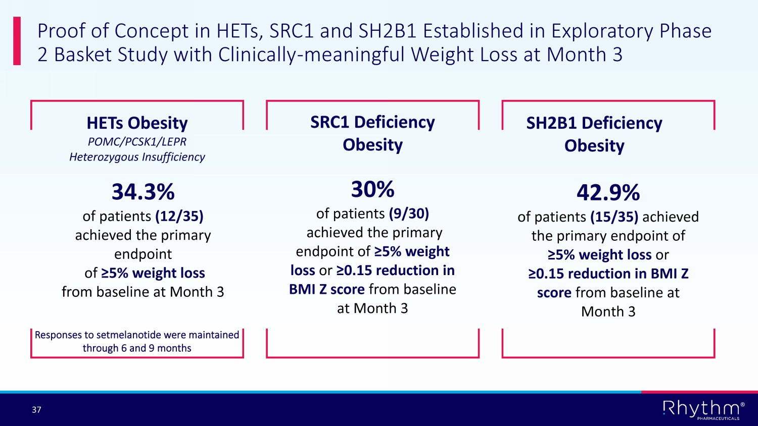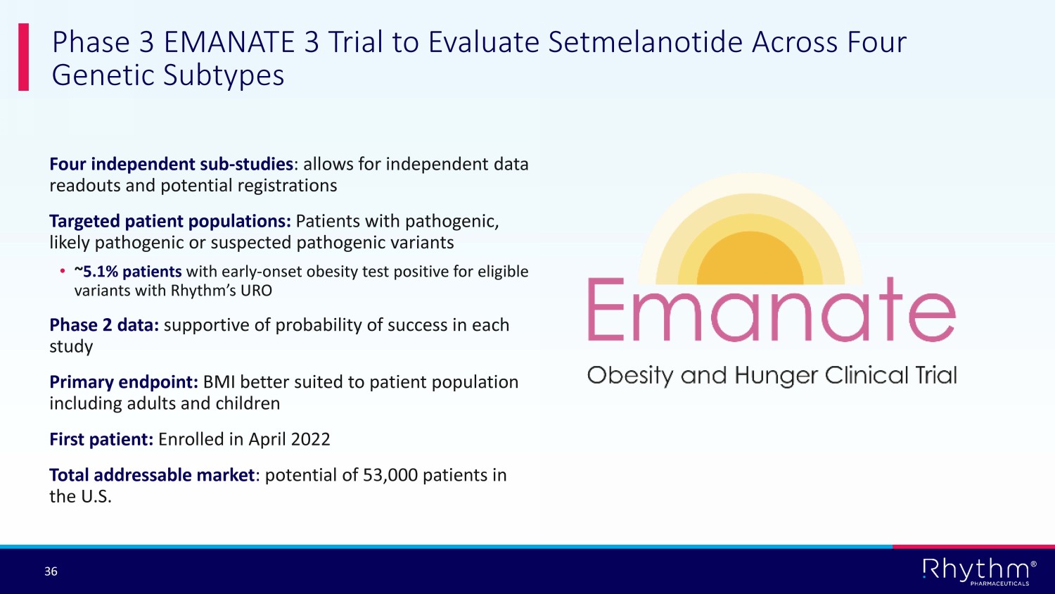 ® 36 Phase 3 EMANATE 3 Trial to Evaluate Setmelanotide Across Four Genetic Subtypes Four independent sub - studies : allows for independent data readouts and potential registrations Targeted patient populations: Patients with pathogenic, likely pathogenic or suspected pathogenic variants • ~ 5.1% patients with early - onset obesity test positive for eligible variants with Rhythm’s URO Phase 2 data: supportive of probability of success in each study Primary endpoint: BMI better suited to patient population including adults and children First patient: Enrolled in April 2022 Total addressable market : potential of 53,000 patients in the U.S.