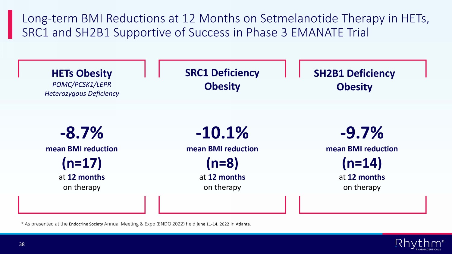 ® 37 Proof of Concept in HETs, SRC1 and SH2B1 Established in Exploratory Phase 2 Basket Study with Clinically - meaningful Weight Loss at Month 3 34.3% of patients (12/35) achieved the primary endpoint of ≥5% weight loss from baseline at Month 3 Responses to setmelanotide were maintained through 6 and 9 months 30% of patients (9/30) achieved the primary endpoint of ≥5% weight loss or ≥0.15 reduction in BMI Z score from baseline at Month 3 SRC1 Deficiency Obesity SH2B1 Deficiency Obesity HETs Obesity POMC/PCSK1/LEPR Heterozygous Insufficiency 42.9% of patients (15/35) achieved the primary endpoint of ≥5% weight loss or ≥0.15 reduction in BMI Z score from baseline at Month 3