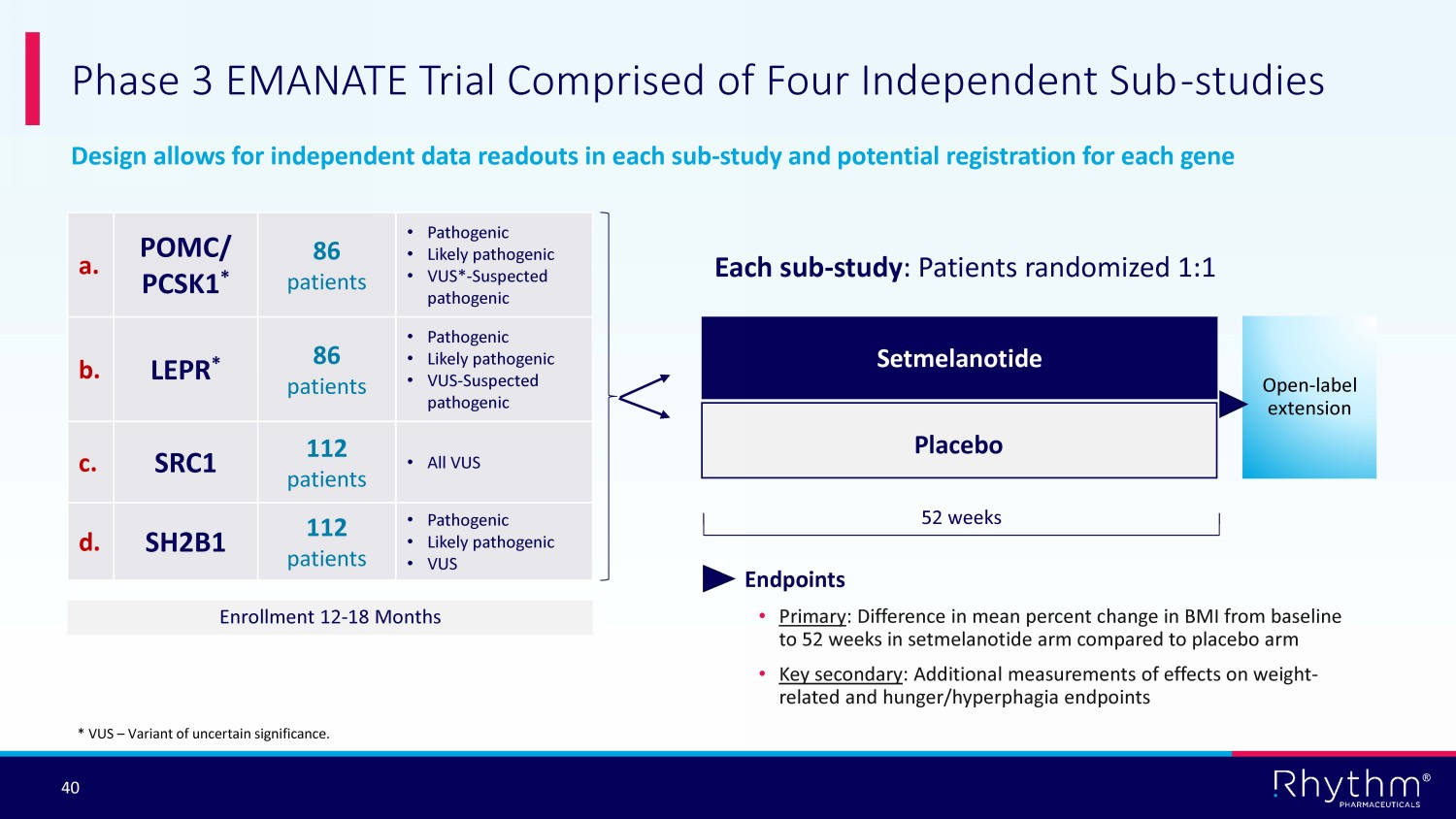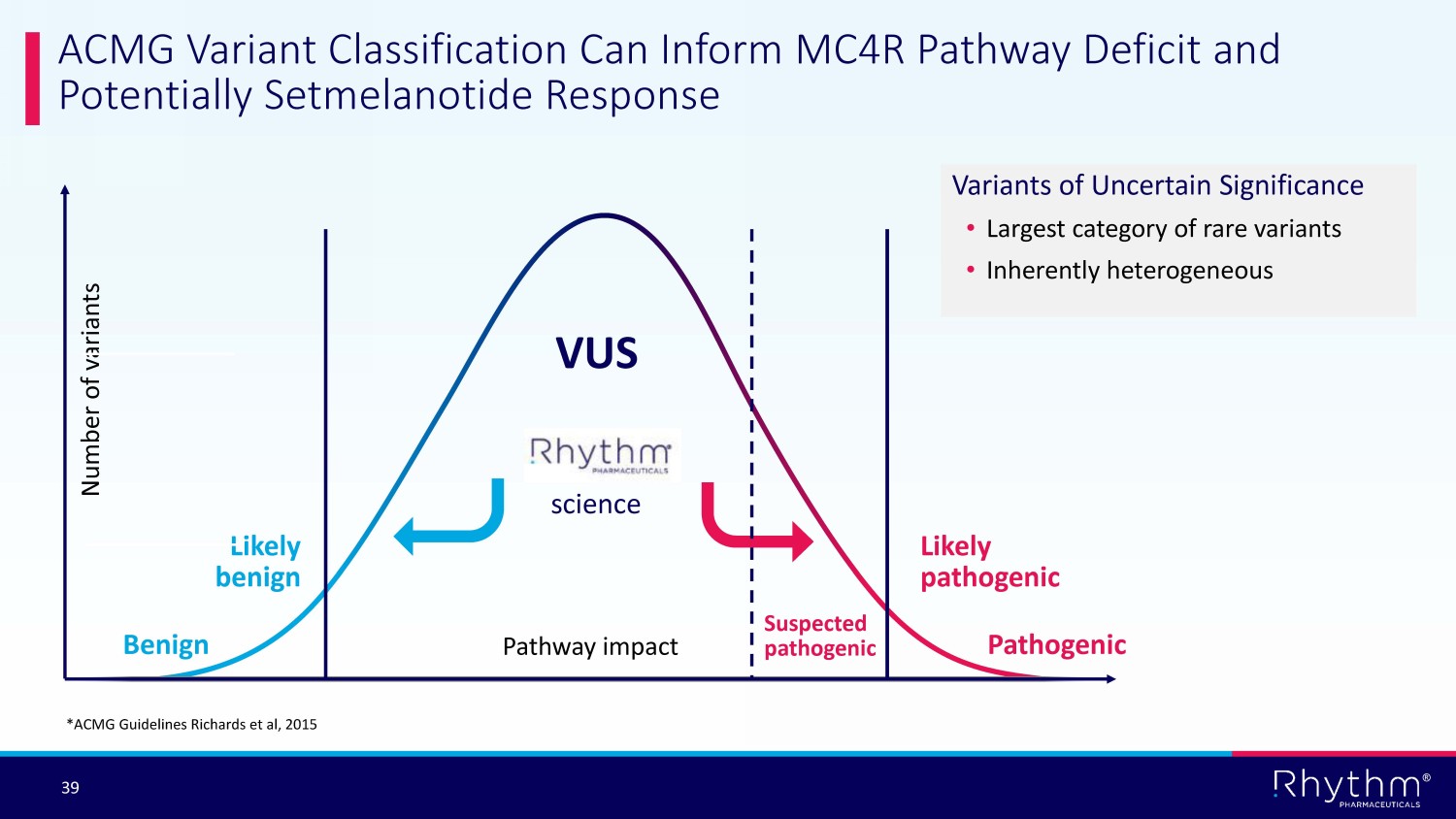 ® 39 ACMG Variant Classification Can Inform MC4R Pathway Deficit and Potentially Setmelanotide Response Pathogenic Likely pathogenic VUS Likely benign Benign Number of variants Pathway impact science *ACMG Guidelines Richards et al, 2015 Variants of Uncertain Significance • Largest category of rare variants • Inherently heterogeneous Suspected pathogenic