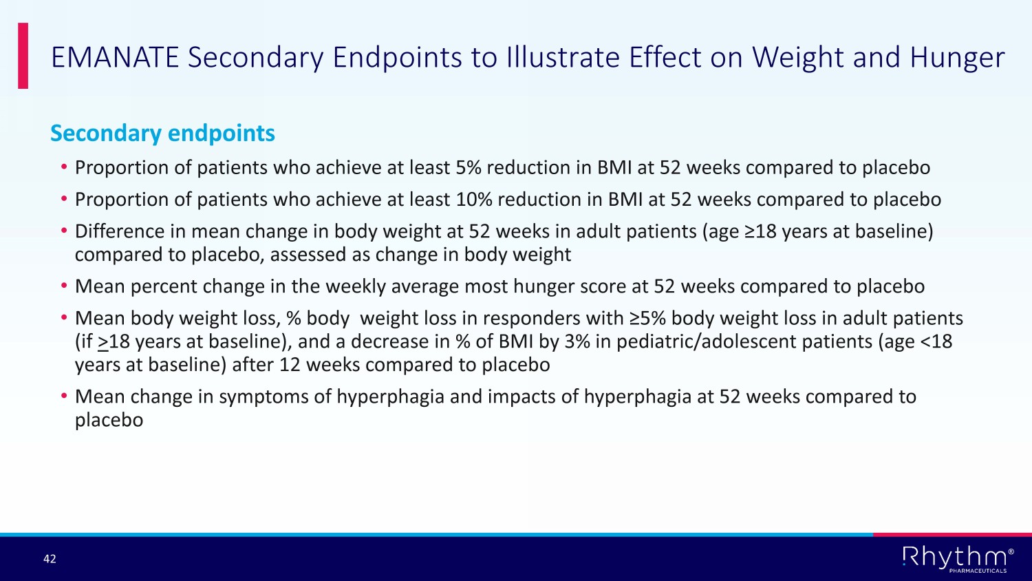 ® 41 Heterozygous POMC/PCSK1 and LEPR sub - studies are 90% powered to show >8% treatment effect vs. placebo SRC1 and SH2B1 sub - studies are 90% powered to show >7% treatment effect vs. placebo Assumption to achieve mean treatment effect v placebo: • The placebo group is not expected to lose weight, even with lifestyle intervention • The placebo group may even gain 2% over 52 weeks • Setmelanotide non - responders demonstrate treatment effect (weight loss, BMI reduction) relative to placebo • Setmelanotide responders anticipated to demonstrate >10% treatment effect at 52 weeks • Setmelanotide mean treatment effect (weighted responder and non - responder) anticipated to be >8% at 52 weeks EMANATE Primary Endpoint: Difference in Mean Percent Change in BMI at 52 Weeks Compared to Placebo PLP: pathogenic, likely pathogenic or suspected pathogenic