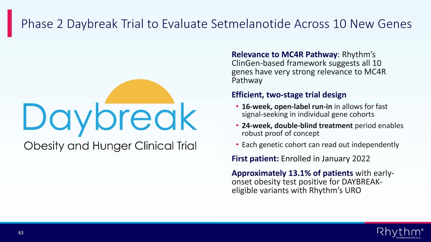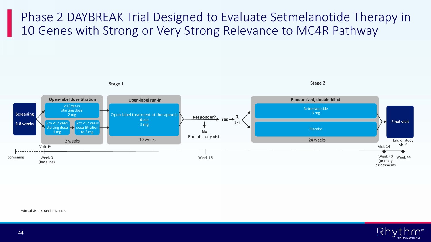 ® 43 Relevance to MC4R Pathway : Rhythm’s ClinGen - based framework suggests all 10 genes have very strong relevance to MC4R Pathway Efficient, two - stage trial design • 16 - week, open - label run - in in allows for fast signal - seeking in individual gene cohorts • 24 - week, double - blind treatment period enables robust proof of concept • Each genetic cohort can read out independently First patient: Enrolled in January 2022 Approximately 13.1% of patients with early - onset obesity test positive for DAYBREAK - eligible variants with Rhythm’s URO Phase 2 Daybreak Trial to Evaluate Setmelanotide Across 10 New Genes