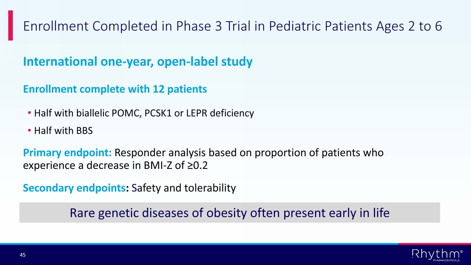 ® 44 Phase 2 DAYBREAK Trial Designed to Evaluate Setmelanotide Therapy in 10 Genes with Strong or Very Strong Relevance to MC4R Pathway ≥12 years starting dose 2 mg 6 to <12 years starting dose 1 mg 6 to <12 years dose titration to 2 mg Open - label dose titration 2 weeks Screening 2 - 8 weeks 10 weeks Open - label treatment at therapeutic dose 3 mg Open - label run - in Week 0 (baseline) Week 16 Screening Visit 1 a R 2:1 Placebo Randomized, double - blind Setmelanotide 3 mg 24 weeks End of study visit a Visit 14 Week 40 (primary assessment) Final visit Stage 1 Stage 2 Responder? Yes No End of study visit Week 44 a Virtual visit. R, randomization.