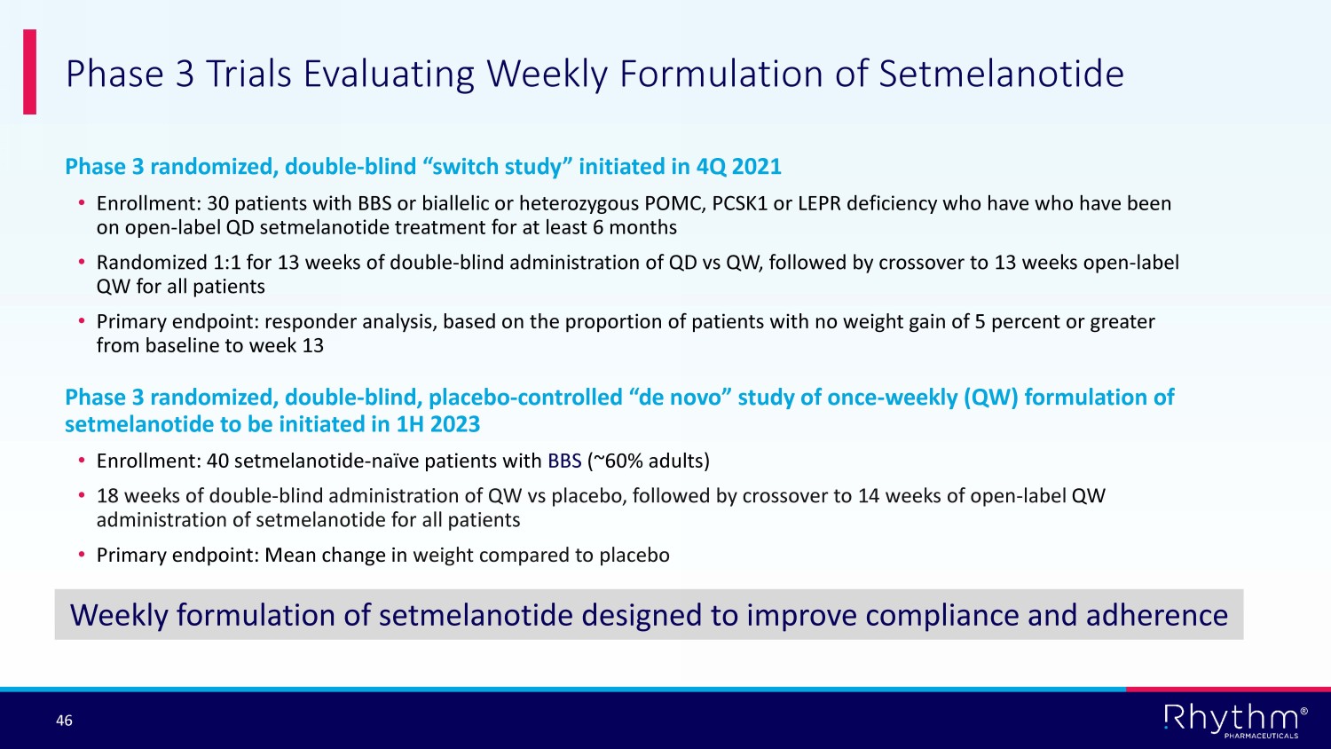 ® 46 Phase 3 randomized, double - blind “switch study” initiated in 4Q 2021 • Enrollment: 30 patients with BBS or biallelic or heterozygous POMC, PCSK1 or LEPR deficiency who have who have been on open - label QD setmelanotide treatment for at least 6 months • Randomized 1:1 for 13 weeks of double - blind administration of QD vs QW, followed by crossover to 13 weeks open - label QW for all patients • Primary endpoint: responder analysis, based on the proportion of patients with no weight gain of 5 percent or greater from baseline to week 13 Phase 3 randomized, double - blind, placebo - controlled “de novo” study of once - weekly (QW) formulation of setmelanotide to be initiated in 1H 2023 • Enrollment: 40 setmelanotide - naïve patients with BBS (~60% adults) • 18 weeks of double - blind administration of QW vs placebo, followed by crossover to 14 weeks of open - label QW administration of setmelanotide for all patients • Primary endpoint: Mean change in weight compared to placebo Phase 3 Trials Evaluating Weekly Formulation of Setmelanotide Weekly formulation of setmelanotide designed to improve compliance and adherence