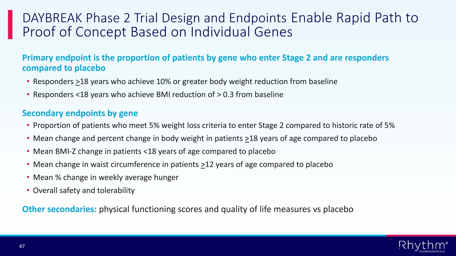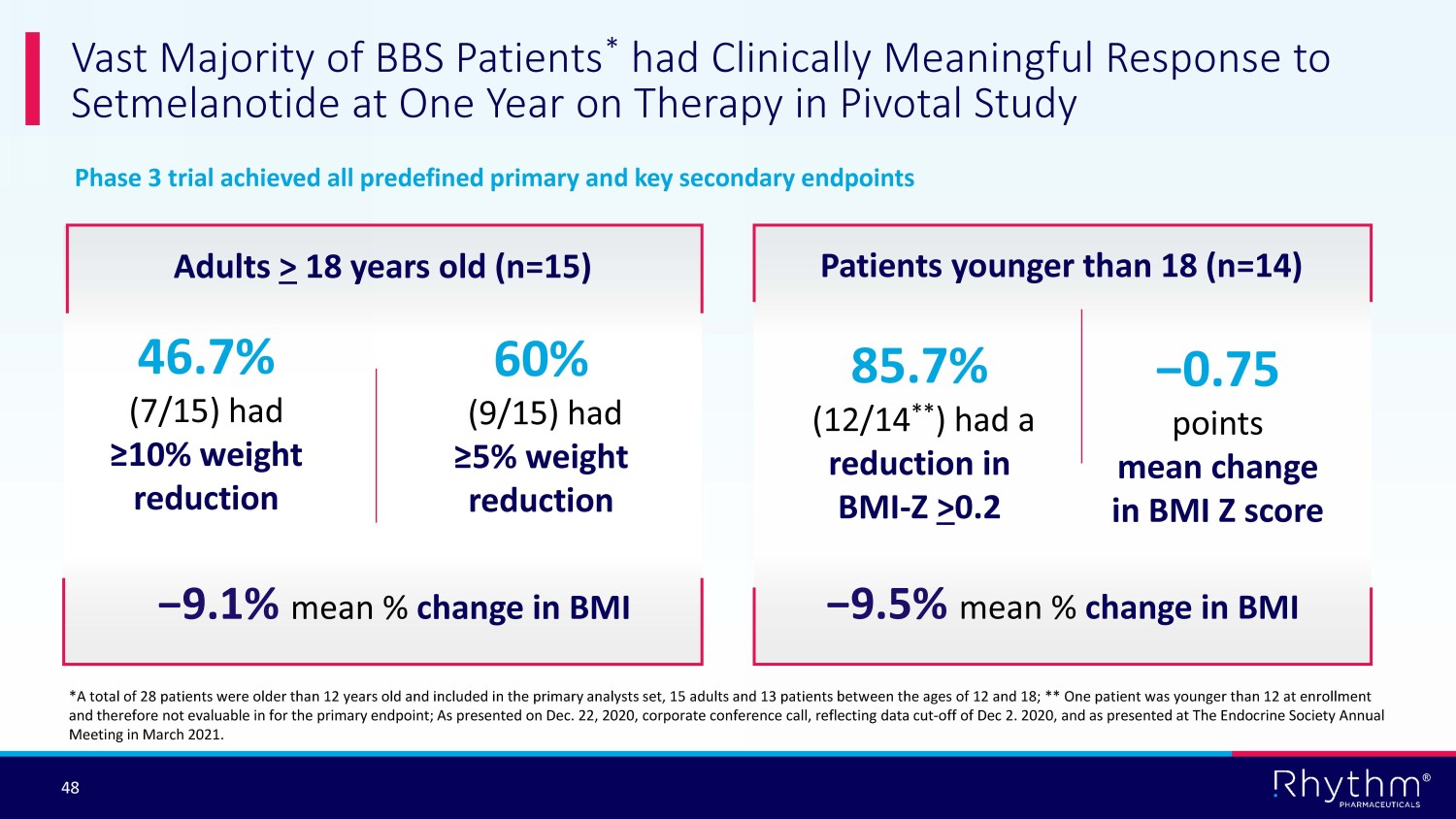 ® 47 Primary endpoint is the proportion of patients by gene who enter Stage 2 and are responders compared to placebo • Responders > 18 years who achieve 10% or greater body weight reduction from baseline • Responders <18 years who achieve BMI reduction of > 0.3 from baseline Secondary endpoints by gene • Proportion of patients who meet 5% weight loss criteria to enter Stage 2 compared to historic rate of 5% • Mean change and percent change in body weight in patients > 18 years of age compared to placebo • Mean BMI - Z change in patients <18 years of age compared to placebo • Mean change in waist circumference in patients > 12 years of age compared to placebo • Mean % change in weekly average hunger • Overall safety and tolerability Other secondaries: physical functioning scores and quality of life measures vs placebo DAYBREAK Phase 2 Trial Design and Endpoints Enable Rapid Path to Proof of Concept Based on Individual Genes