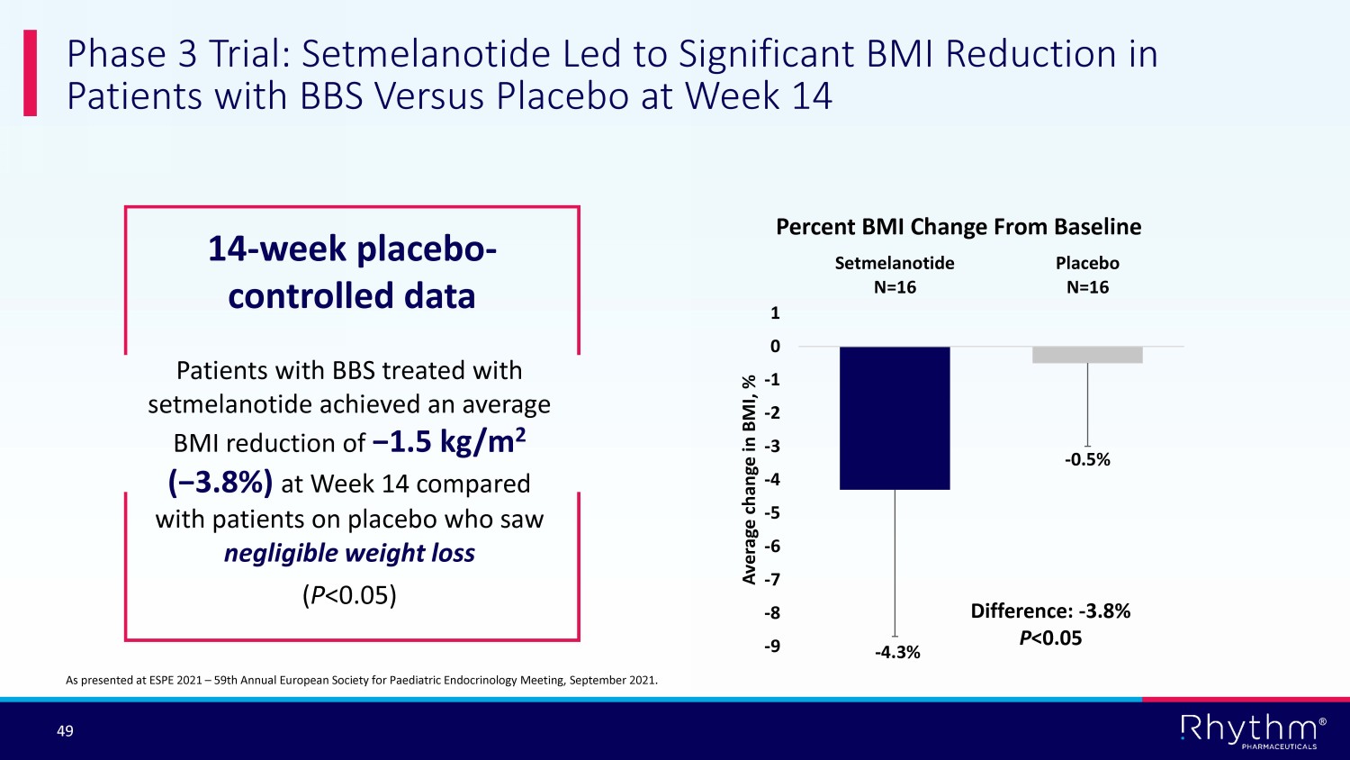 ® 48 Vast Majority of BBS Patients * had Clinically Meaningful Response to Setmelanotide at One Year on Therapy in Pivotal Study *A total of 28 patients were older than 12 years old and included in the primary analysts set, 15 adults and 13 patients betw een the ages of 12 and 18; ** One patient was younger than 12 at enrollment and therefore not evaluable in for the primary endpoint; As presented on Dec. 22, 2020, corporate conference call, reflecting da ta cut - off of Dec 2. 2020, and as presented at The Endocrine Society Annual Meeting in March 2021. 60% (9/15) had ≥5% weight reduction 46.7% (7/15) had ≥10% weight reduction 85.7% (12/14 ** ) had a reduction in BMI - Z > 0.2 −0.75 points mean change in BMI Z score Adults > 18 years old (n=15) Patients younger than 18 (n=14) −9.5% mean % change in BMI −9.1% mean % change in BMI Phase 3 trial achieved all predefined primary and key secondary endpoints