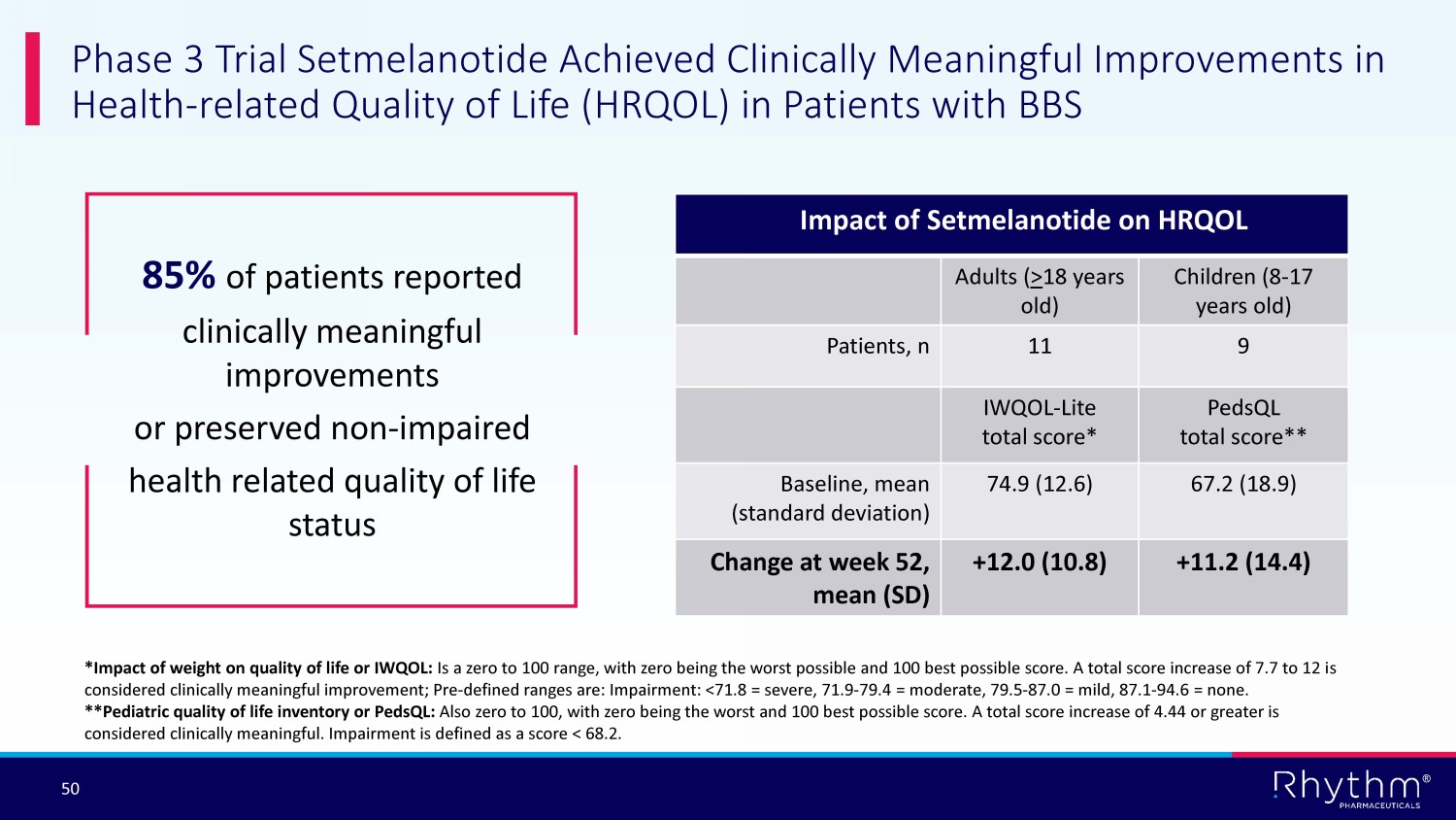 ® 50 Phase 3 Trial Setmelanotide Achieved Clinically Meaningful Improvements in Health - related Quality of Life (HRQOL) in Patients with BBS 85% of patients reported clinically meaningful improvements or preserved non - impaired health related quality of life status Adults ( > 18 years old) Children (8 - 17 years old) Patients, n 11 9 IWQOL - Lite total score* PedsQL total score** Baseline, mean (standard deviation) 74.9 (12.6) 67.2 (18.9) Change at week 52, mean (SD) +12.0 (10.8) +11.2 (14.4) *Impact of weight on quality of life or IWQOL: Is a zero to 100 range, with zero being the worst possible and 100 best possible score. A total score increase of 7.7 to 12 i s considered clinically meaningful improvement; Pre - defined ranges are: Impairment: <71.8 = severe, 71.9 - 79.4 = moderate, 79.5 - 87. 0 = mild, 87.1 - 94.6 = none. **Pediatric quality of life inventory or PedsQL : Also zero to 100, with zero being the worst and 100 best possible score. A total score increase of 4.44 or greater is considered clinically meaningful. Impairment is defined as a score < 68.2. Impact of Setmelanotide on HRQOL