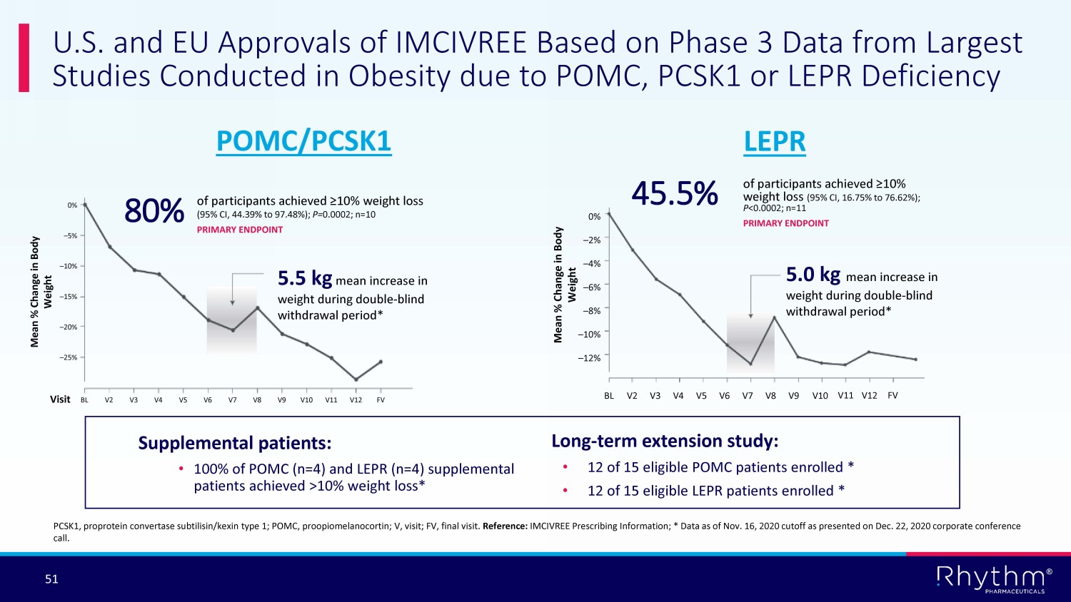 ® 51 Mean % Change in Body Weight Visit BL V2 V3 V4 V5 V6 V7 V8 V9 V10 V11 V12 FV 0% – 5% – 10% – 15% – 20% – 25% Mean % Change in Body Weight BL V2 V3 V4 V5 V6 V7 V8 V9 V10 V12 FV 0% – 2% – 4% – 6% – 8% – 12% – 10% U.S. and EU Approvals of IMCIVREE Based on Phase 3 Data from Largest Studies Conducted in Obesity due to POMC, PCSK1 or LEPR Deficiency PCSK1, proprotein convertase subtilisin/kexin type 1; POMC, proopiomelanocortin; V, visit; FV, final visit . Reference: IMCIVREE Prescribing Information; * Data as of Nov. 16, 2020 cutoff as presented on Dec. 22, 2020 corporate conference call. POMC/PCSK1 5.5 kg mean increase in weight during double - blind withdrawal period* LEPR 5.0 kg mean increase in weight during double - blind withdrawal period* of participants achieved ≥10% weight loss (95% CI, 44.39% to 97.48%); P= 0.0002; n=10 PRIMARY ENDPOINT of participants achieved ≥10% weight loss (95% CI, 16.75% to 76.62%); P <0.0002; n=11 PRIMARY ENDPOINT 80% 45.5% Long - term extension study: • 12 of 15 eligible POMC patients enrolled * • 12 of 15 eligible LEPR patients enrolled * V11 Supplemental patients: • 100% of POMC (n=4) and LEPR (n=4) supplemental patients achieved >10% weight loss*
