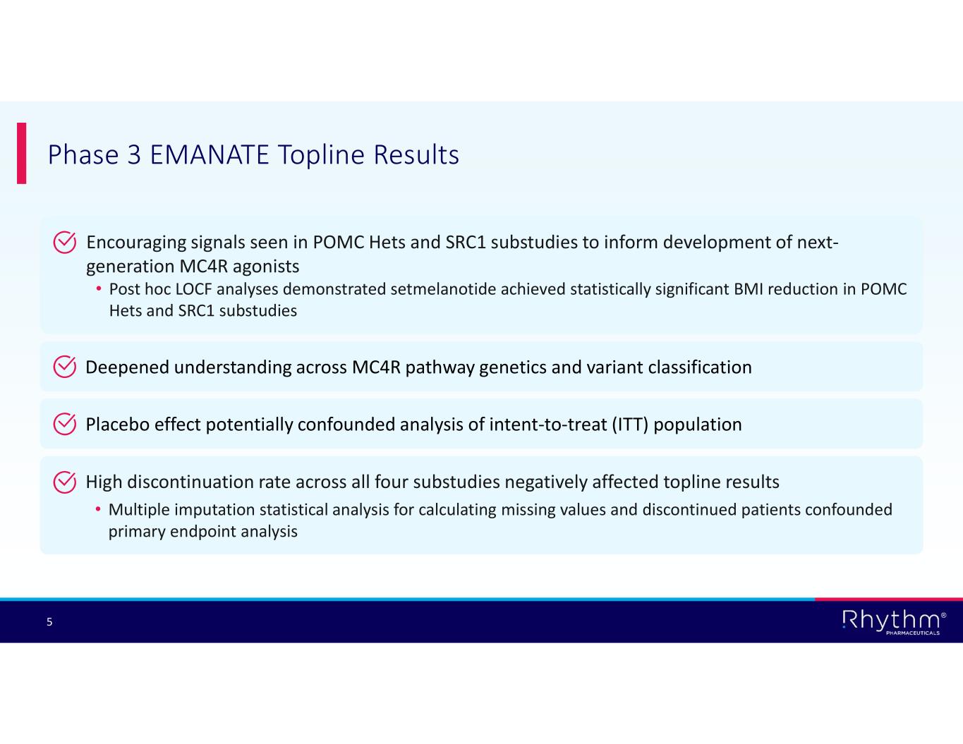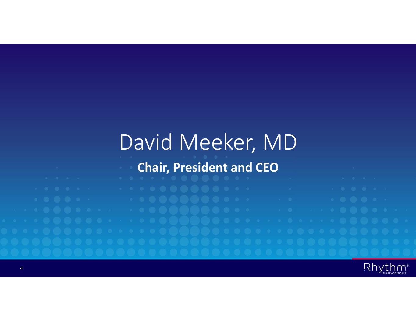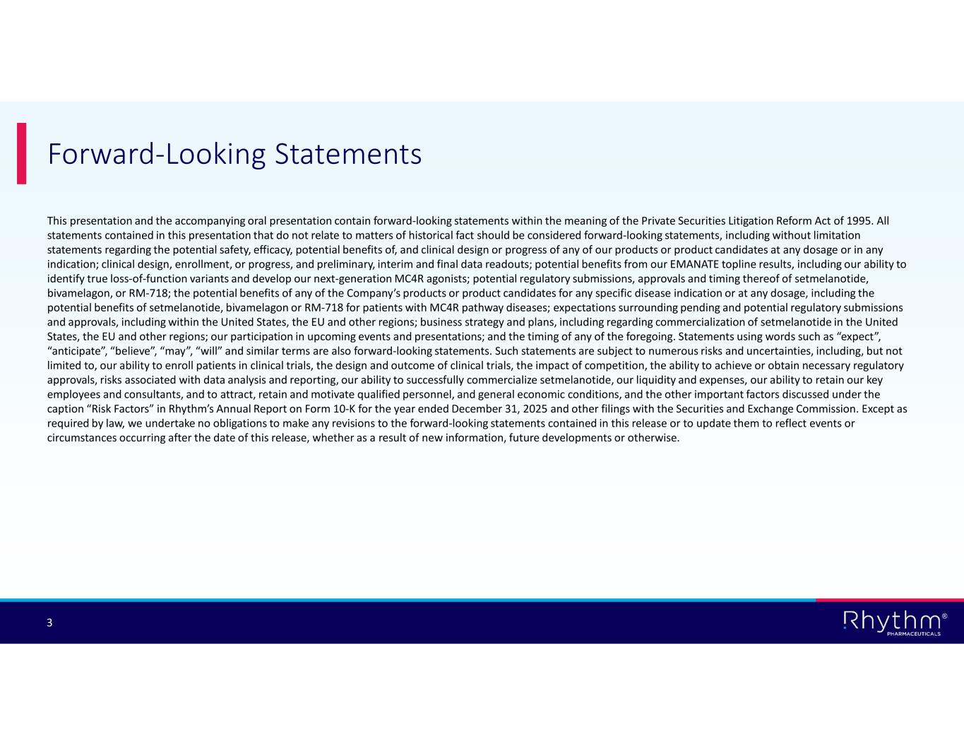 ® 3 This presentation and the accompanying oral presentation contain forward-looking statements within the meaning of the Private Securities Litigation Reform Act of 1995. All statements contained in this presentation that do not relate to matters of historical fact should be considered forward-looking statements, including without limitation statements regarding the potential safety, efficacy, potential benefits of, and clinical design or progress of any of our products or product candidates at any dosage or in any indication; clinical design, enrollment, or progress, and preliminary, interim and final data readouts; potential benefits from our EMANATE topline results, including our ability to identify true loss-of-function variants and develop our next-generation MC4R agonists; potential regulatory submissions, approvals and timing thereof of setmelanotide, bivamelagon, or RM-718; the potential benefits of any of the Company’s products or product candidates for any specific disease indication or at any dosage, including the potential benefits of setmelanotide, bivamelagon or RM-718 for patients with MC4R pathway diseases; expectations surrounding pending and potential regulatory submissions and approvals, including within the United States, the EU and other regions; business strategy and plans, including regarding commercialization of setmelanotide in the United States, the EU and other regions; our participation in upcoming events and presentations; and the timing of any of the foregoing. Statements using words such as “expect”, “anticipate”, “believe”, “may”, “will” and similar terms are also forward-looking statements. Such statements are subject to numerous risks and uncertainties, including, but not limited to, our ability to enroll patients in clinical trials, the design and outcome of clinical trials, the impact of competition, the ability to achieve or obtain necessary regulatory approvals, risks associated with data analysis and reporting, our ability to successfully commercialize setmelanotide, our liquidity and expenses, our ability to retain our key employees and consultants, and to attract, retain and motivate qualified personnel, and general economic conditions, and the other important factors discussed under the caption “Risk Factors” in Rhythm’s Annual Report on Form 10-K for the year ended December 31, 2025 and other filings with the Securities and Exchange Commission. Except as required by law, we undertake no obligations to make any revisions to the forward-looking statements contained in this release or to update them to reflect events or circumstances occurring after the date of this release, whether as a result of new information, future developments or otherwise. Forward-Looking Statements