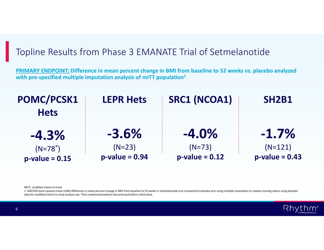 ® 5 Phase 3 EMANATE Topline Results Encouraging signals seen in POMC Hets and SRC1 substudies to inform development of next- generation MC4R agonists • Post hoc LOCF analyses demonstrated setmelanotide achieved statistically significant BMI reduction in POMC Hets and SRC1 substudies Deepened understanding across MC4R pathway genetics and variant classification Placebo effect potentially confounded analysis of intent-to-treat (ITT) population High discontinuation rate across all four substudies negatively affected topline results • Multiple imputation statistical analysis for calculating missing values and discontinued patients confounded primary endpoint analysis
