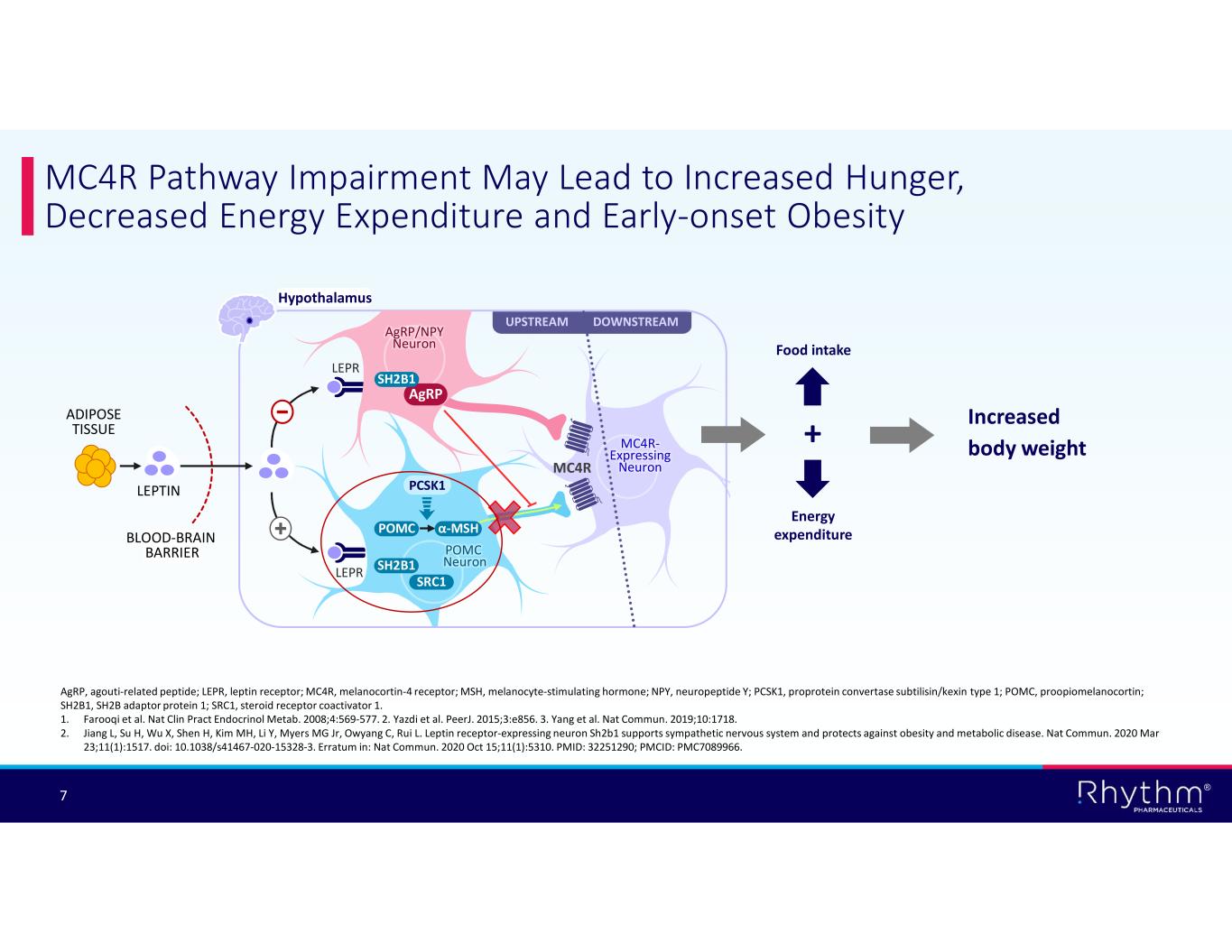 ® 7 MC4R Pathway Impairment May Lead to Increased Hunger, Decreased Energy Expenditure and Early-onset Obesity AgRP, agouti-related peptide; LEPR, leptin receptor; MC4R, melanocortin-4 receptor; MSH, melanocyte-stimulating hormone; NPY, neuropeptide Y; PCSK1, proprotein convertase subtilisin/kexin type 1; POMC, proopiomelanocortin; SH2B1, SH2B adaptor protein 1; SRC1, steroid receptor coactivator 1. 1. Farooqi et al. Nat Clin Pract Endocrinol Metab. 2008;4:569-577. 2. Yazdi et al. PeerJ. 2015;3:e856. 3. Yang et al. Nat Commun. 2019;10:1718. 2. Jiang L, Su H, Wu X, Shen H, Kim MH, Li Y, Myers MG Jr, Owyang C, Rui L. Leptin receptor-expressing neuron Sh2b1 supports sympathetic nervous system and protects against obesity and metabolic disease. Nat Commun. 2020 Mar 23;11(1):1517. doi: 10.1038/s41467-020-15328-3. Erratum in: Nat Commun. 2020 Oct 15;11(1):5310. PMID: 32251290; PMCID: PMC7089966. UPSTREAM DOWNSTREAM MC4R- Expressing Neuron PCSK1 MC4R LEPR POMC LEPR POMC Neuron Hypothalamus AgRP/NPY Neuron AgRP α-MSH ADIPOSE TISSUE LEPTIN BLOOD-BRAIN BARRIER SRC1 SH2B1 SH2B1 Increased body weight+ Energy expenditure Food intake