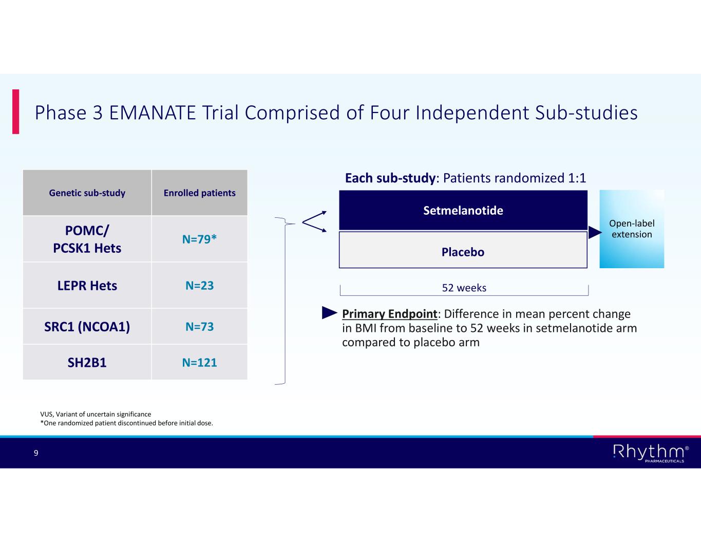 ® 8 Variant Pathogenicity Defines MC4R Pathway Dysfunction and Is Subject to Reclassification Pathogenic (P) Likely Pathogenic (LP) VUS Likely Benign Benign N um be r o f v ar ia nt s Pathway impact*ACMG Guidelines Richards et al, 2015 Suspected Pathogenic (SP) ACMG Classification entry criteria EMANATE Sub- study • P/LP • VUS-SP POMC/ PCSK1 Hets • P/LP • VUS-SPLEPR Hets • All VUSSRC1 (NCOA1) • P/LP • VUSSH2B1