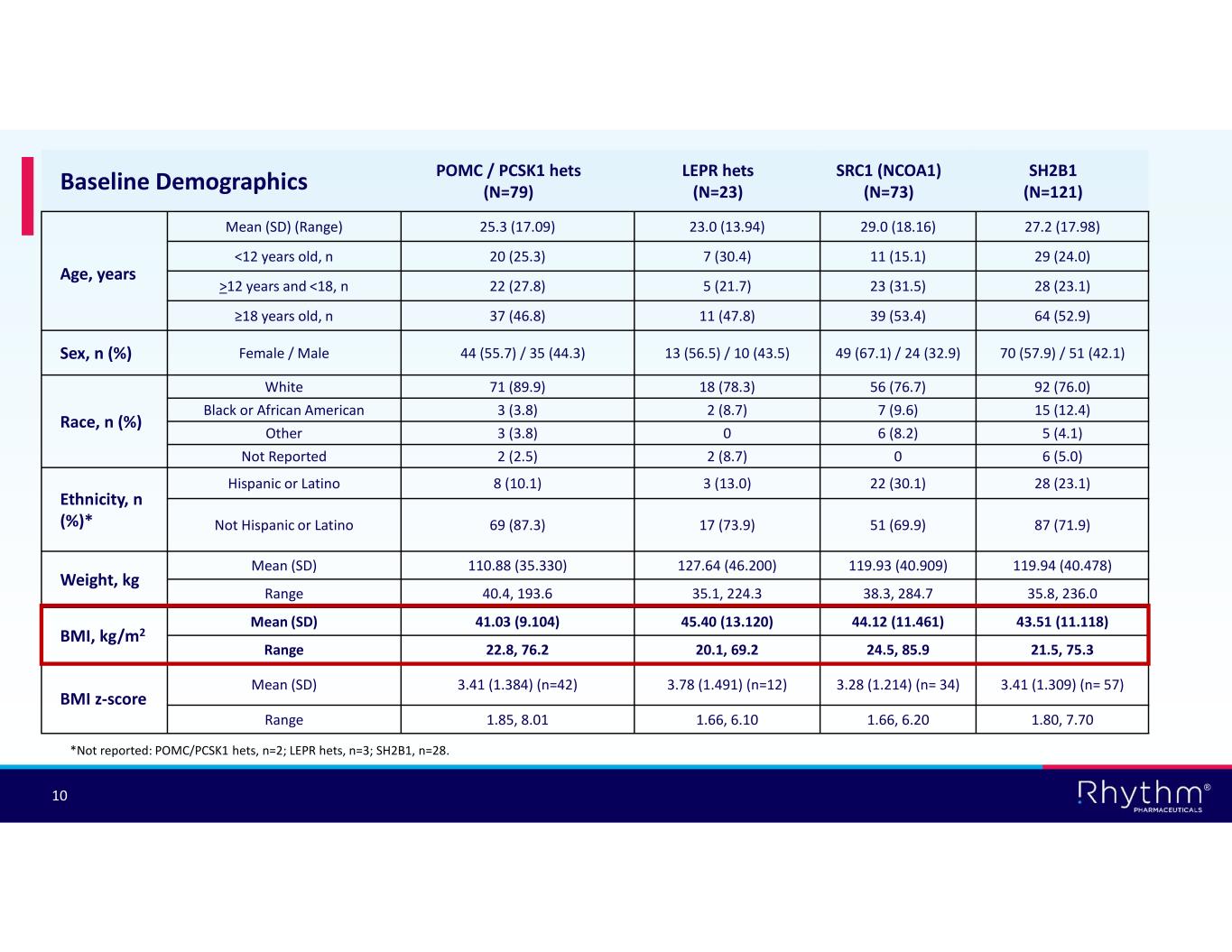 ® 10 SH2B1 (N=121) SRC1 (NCOA1) (N=73) LEPR hets (N=23) POMC / PCSK1 hets (N=79)Baseline Demographics 27.2 (17.98)29.0 (18.16)23.0 (13.94)25.3 (17.09) Mean (SD) (Range) Age, years 29 (24.0)11 (15.1)7 (30.4)20 (25.3)<12 years old, n 28 (23.1)23 (31.5)5 (21.7)22 (27.8)>12 years and <18, n 64 (52.9)39 (53.4)11 (47.8)37 (46.8)≥18 years old, n 70 (57.9) / 51 (42.1)49 (67.1) / 24 (32.9)13 (56.5) / 10 (43.5)44 (55.7) / 35 (44.3) Female / MaleSex, n (%) 92 (76.0)56 (76.7)18 (78.3)71 (89.9)White Race, n (%) 15 (12.4)7 (9.6)2 (8.7)3 (3.8)Black or African American 5 (4.1)6 (8.2)03 (3.8)Other 6 (5.0)02 (8.7)2 (2.5)Not Reported 28 (23.1)22 (30.1)3 (13.0)8 (10.1)Hispanic or Latino Ethnicity, n (%)* 87 (71.9)51 (69.9)17 (73.9)69 (87.3)Not Hispanic or Latino 119.94 (40.478)119.93 (40.909)127.64 (46.200)110.88 (35.330)Mean (SD) Weight, kg 35.8, 236.038.3, 284.735.1, 224.340.4, 193.6Range 43.51 (11.118)44.12 (11.461)45.40 (13.120)41.03 (9.104)Mean (SD) BMI, kg/m2 21.5, 75.324.5, 85.920.1, 69.222.8, 76.2Range 3.41 (1.309) (n= 57)3.28 (1.214) (n= 34)3.78 (1.491) (n=12)3.41 (1.384) (n=42)Mean (SD) BMI z-score 1.80, 7.701.66, 6.201.66, 6.101.85, 8.01Range *Not reported: POMC/PCSK1 hets, n=2; LEPR hets, n=3; SH2B1, n=28.