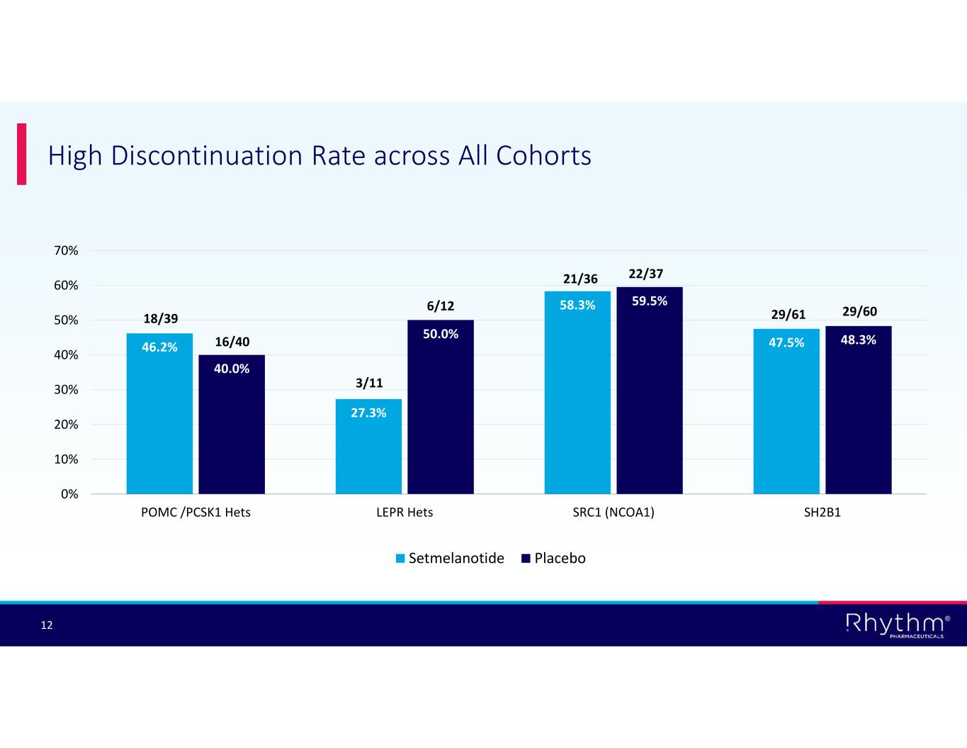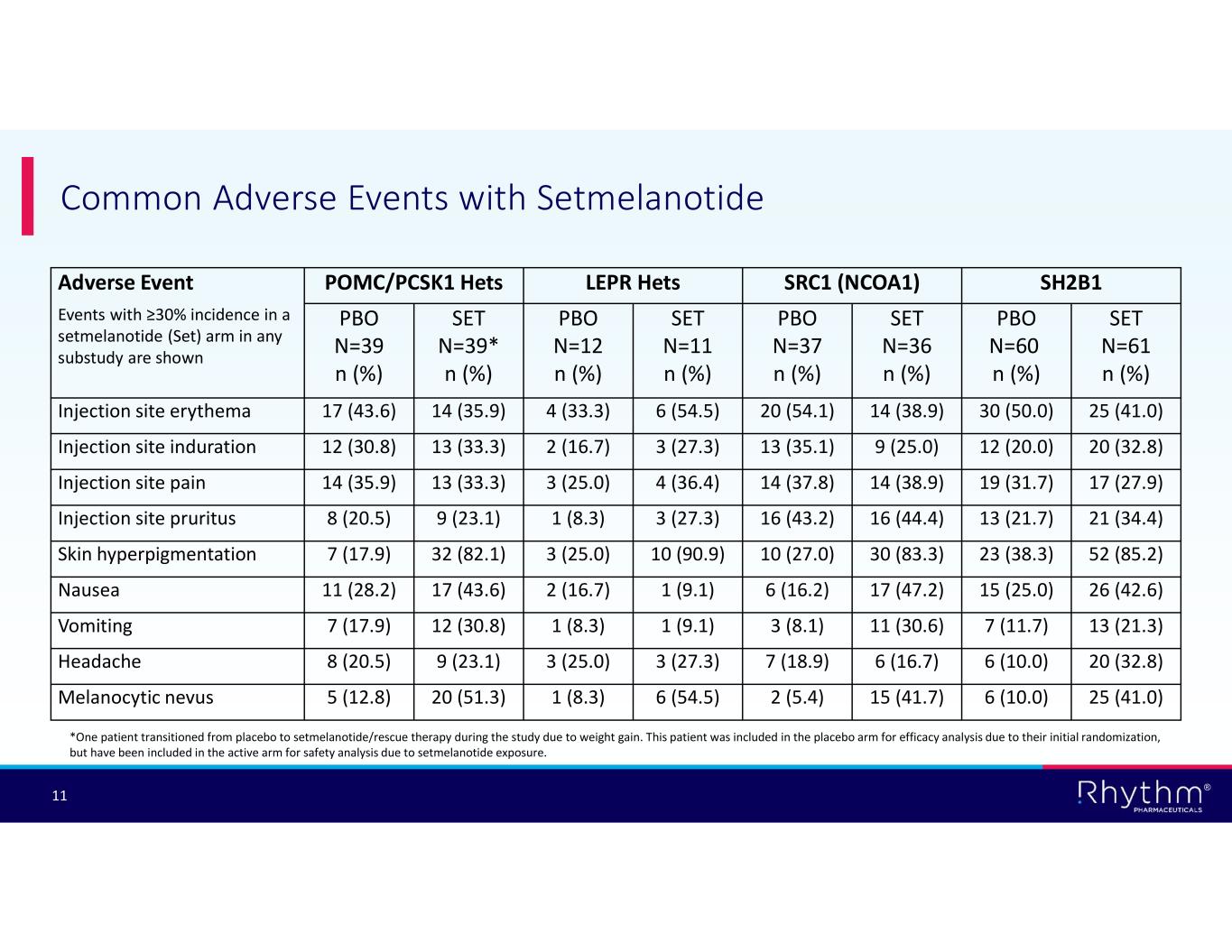 ® 11 Common Adverse Events with Setmelanotide SH2B1SRC1 (NCOA1)LEPR HetsPOMC/PCSK1 HetsAdverse Event Events with ≥30% incidence in a setmelanotide (Set) arm in any substudy are shown SET N=61 n (%) PBO N=60 n (%) SET N=36 n (%) PBO N=37 n (%) SET N=11 n (%) PBO N=12 n (%) SET N=39* n (%) PBO N=39 n (%) 25 (41.0)30 (50.0)14 (38.9)20 (54.1)6 (54.5)4 (33.3)14 (35.9)17 (43.6)Injection site erythema 20 (32.8)12 (20.0)9 (25.0)13 (35.1)3 (27.3)2 (16.7)13 (33.3)12 (30.8)Injection site induration 17 (27.9)19 (31.7)14 (38.9)14 (37.8)4 (36.4)3 (25.0)13 (33.3)14 (35.9)Injection site pain 21 (34.4)13 (21.7)16 (44.4)16 (43.2)3 (27.3)1 (8.3)9 (23.1)8 (20.5)Injection site pruritus 52 (85.2)23 (38.3)30 (83.3)10 (27.0)10 (90.9)3 (25.0)32 (82.1)7 (17.9)Skin hyperpigmentation 26 (42.6)15 (25.0)17 (47.2)6 (16.2)1 (9.1)2 (16.7)17 (43.6)11 (28.2)Nausea 13 (21.3)7 (11.7)11 (30.6)3 (8.1)1 (9.1)1 (8.3)12 (30.8)7 (17.9)Vomiting 20 (32.8)6 (10.0)6 (16.7)7 (18.9)3 (27.3)3 (25.0)9 (23.1)8 (20.5)Headache 25 (41.0)6 (10.0)15 (41.7)2 (5.4)6 (54.5)1 (8.3)20 (51.3)5 (12.8)Melanocytic nevus *One patient transitioned from placebo to setmelanotide/rescue therapy during the study due to weight gain. This patient was included in the placebo arm for efficacy analysis due to their initial randomization, but have been included in the active arm for safety analysis due to setmelanotide exposure.