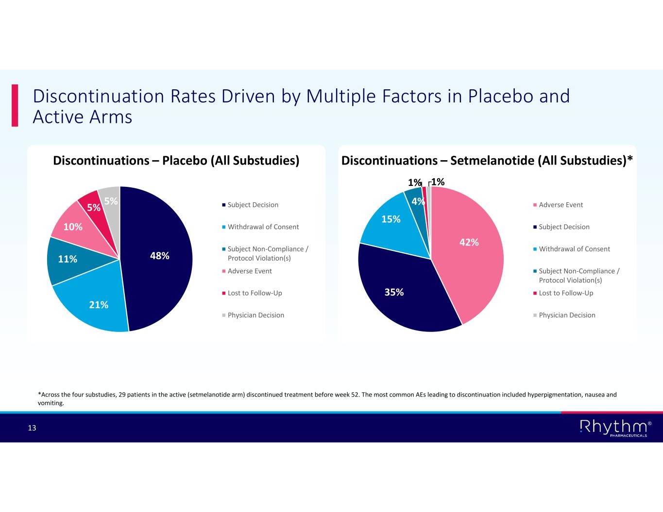 ® 12 High Discontinuation Rate across All Cohorts 46.2% 27.3% 58.3% 47.5% 40.0% 50.0% 59.5% 48.3% 0% 10% 20% 30% 40% 50% 60% 70% POMC /PCSK1 Hets LEPR Hets SRC1 (NCOA1) SH2B1 Setmelanotide Placebo 18/39 16/40 3/11 6/12 21/36 22/37 29/61 29/60