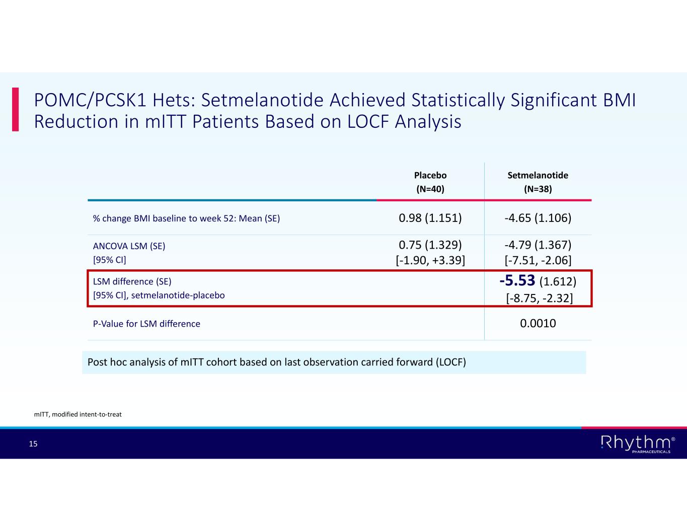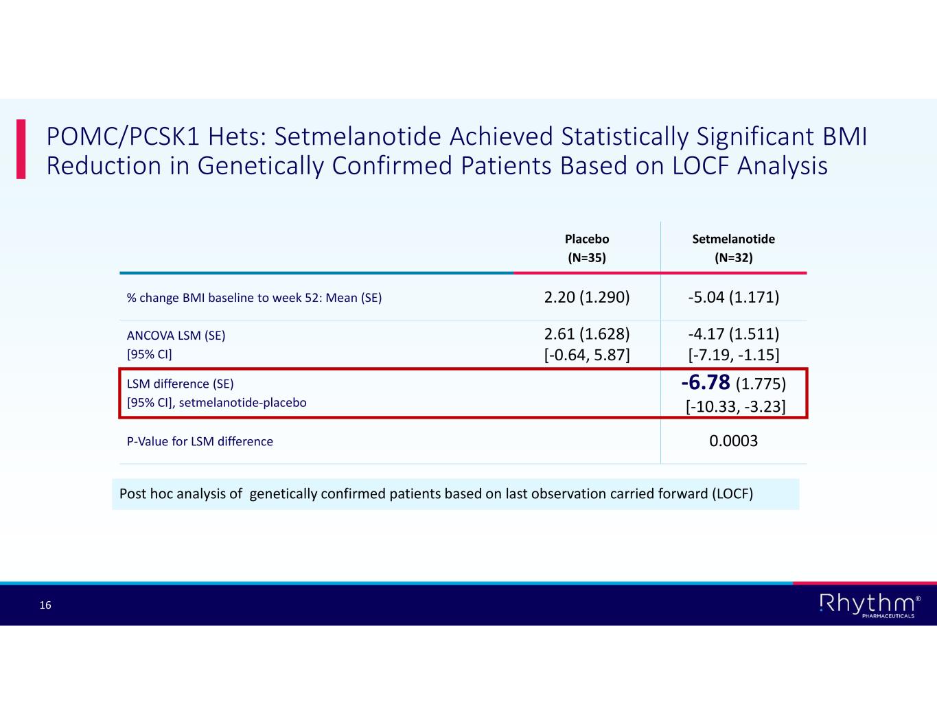 ® 15 POMC/PCSK1 Hets: Setmelanotide Achieved Statistically Significant BMI Reduction in mITT Patients Based on LOCF Analysis Post hoc analysis of mITT cohort based on last observation carried forward (LOCF) Setmelanotide (N=38) Placebo (N=40) -4.65 (1.106)0.98 (1.151)% change BMI baseline to week 52: Mean (SE) -4.79 (1.367) [-7.51, -2.06] 0.75 (1.329) [-1.90, +3.39] ANCOVA LSM (SE) [95% CI] -5.53 (1.612) [-8.75, -2.32] LSM difference (SE) [95% CI], setmelanotide-placebo 0.0010P-Value for LSM difference mITT, modified intent-to-treat