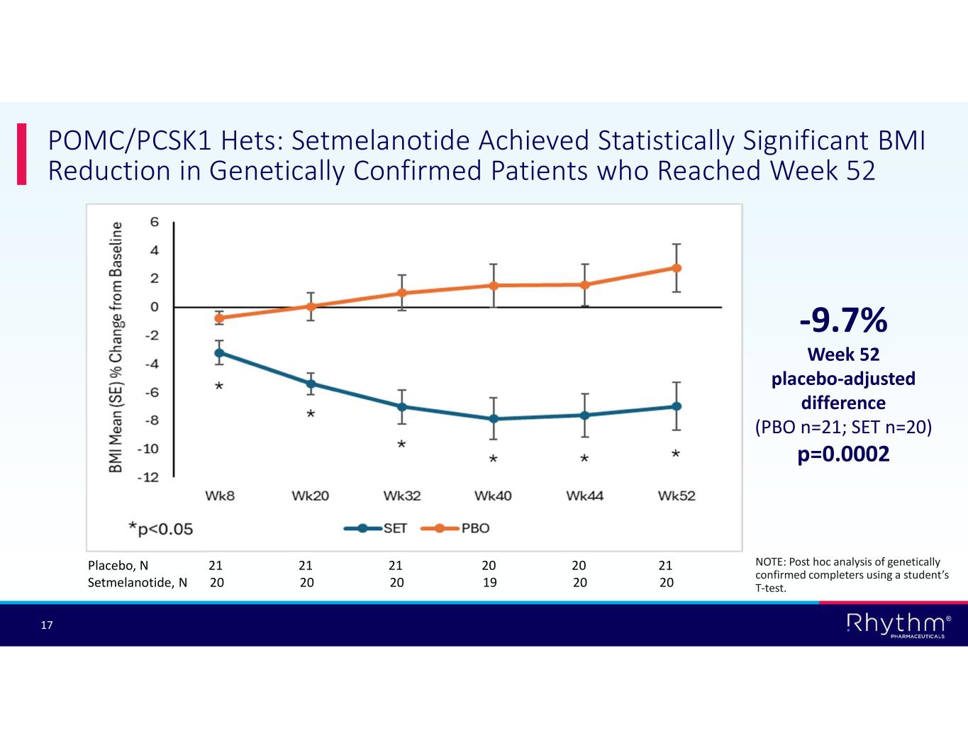 ® 16 POMC/PCSK1 Hets: Setmelanotide Achieved Statistically Significant BMI Reduction in Genetically Confirmed Patients Based on LOCF Analysis Post hoc analysis of genetically confirmed patients based on last observation carried forward (LOCF) Setmelanotide (N=32) Placebo (N=35) -5.04 (1.171)2.20 (1.290)% change BMI baseline to week 52: Mean (SE) -4.17 (1.511) [-7.19, -1.15] 2.61 (1.628) [-0.64, 5.87] ANCOVA LSM (SE) [95% CI] -6.78 (1.775) [-10.33, -3.23] LSM difference (SE) [95% CI], setmelanotide-placebo 0.0003P-Value for LSM difference