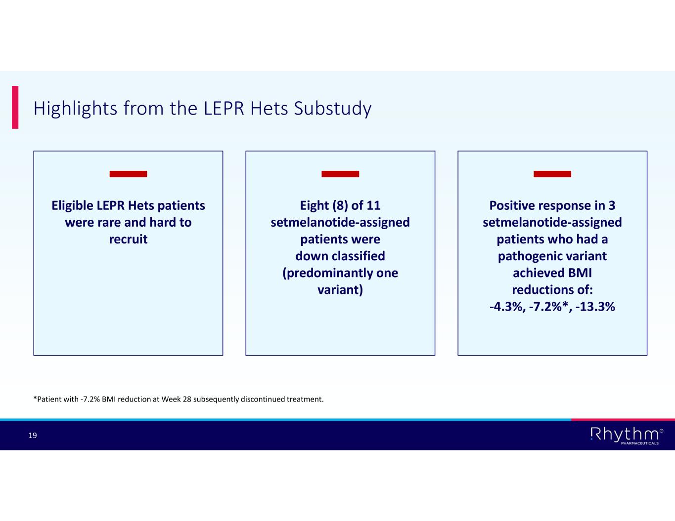 ® 19 Highlights from the LEPR Hets Substudy *Patient with -7.2% BMI reduction at Week 28 subsequently discontinued treatment. Eligible LEPR Hets patients were rare and hard to recruit Eight (8) of 11 setmelanotide-assigned patients were down classified (predominantly one variant) Positive response in 3 setmelanotide-assigned patients who had a pathogenic variant achieved BMI reductions of: -4.3%, -7.2%*, -13.3%