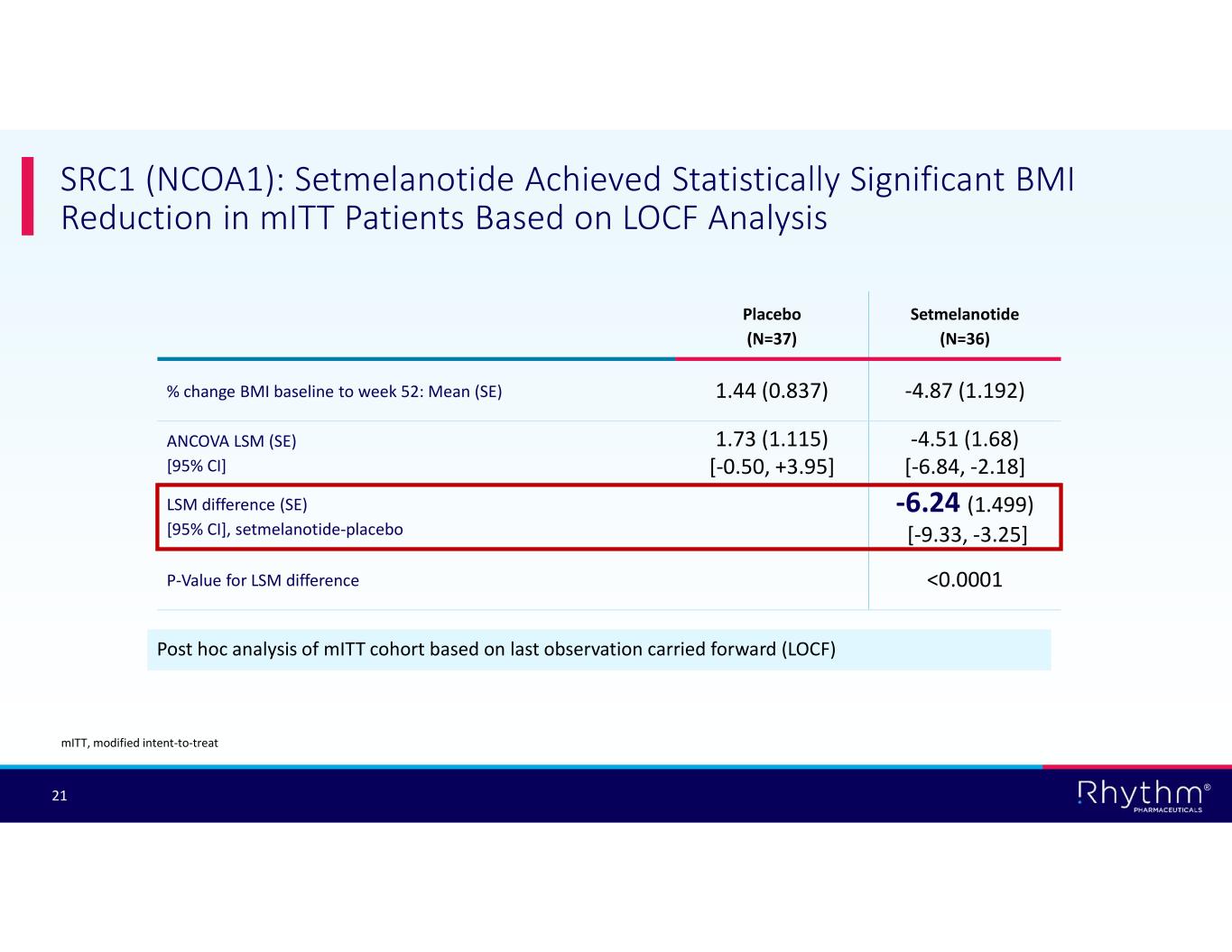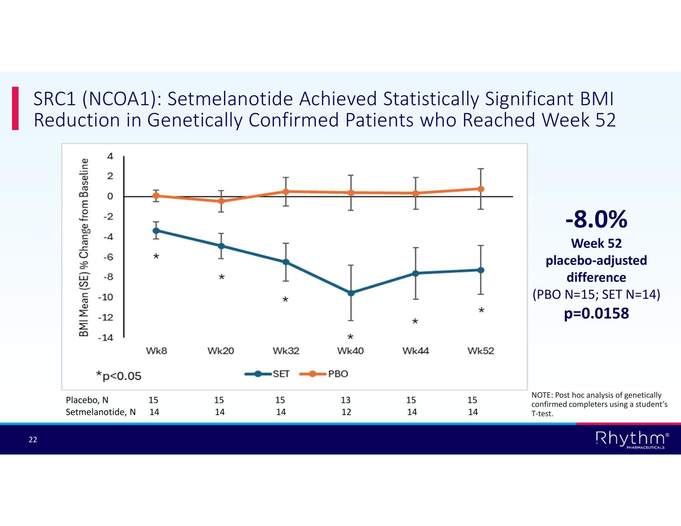 ® 21 SRC1 (NCOA1): Setmelanotide Achieved Statistically Significant BMI Reduction in mITT Patients Based on LOCF Analysis Post hoc analysis of mITT cohort based on last observation carried forward (LOCF) Setmelanotide (N=36) Placebo (N=37) -4.87 (1.192)1.44 (0.837)% change BMI baseline to week 52: Mean (SE) -4.51 (1.68) [-6.84, -2.18] 1.73 (1.115) [-0.50, +3.95] ANCOVA LSM (SE) [95% CI] -6.24 (1.499) [-9.33, -3.25] LSM difference (SE) [95% CI], setmelanotide-placebo <0.0001P-Value for LSM difference mITT, modified intent-to-treat