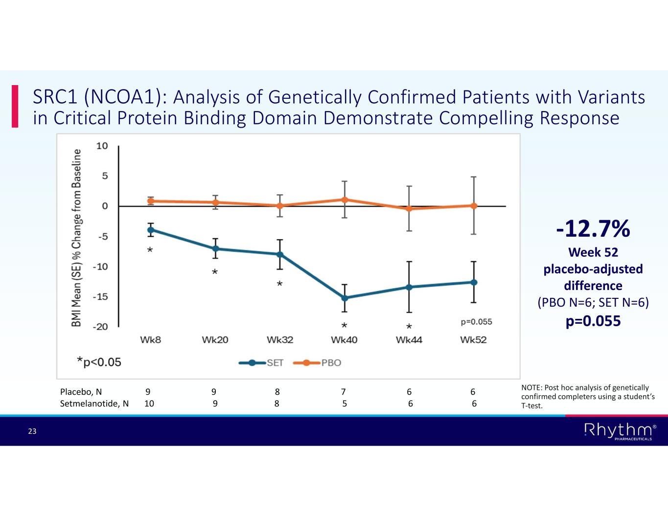 ® 22 SRC1 (NCOA1): Setmelanotide Achieved Statistically Significant BMI Reduction in Genetically Confirmed Patients who Reached Week 52 -8.0% Week 52 placebo-adjusted difference (PBO N=15; SET N=14) p=0.0158 Placebo, N 15 15 15 13 15 15 Setmelanotide, N 14 14 14 12 14 14 NOTE: Post hoc analysis of genetically confirmed completers using a student’s T-test.
