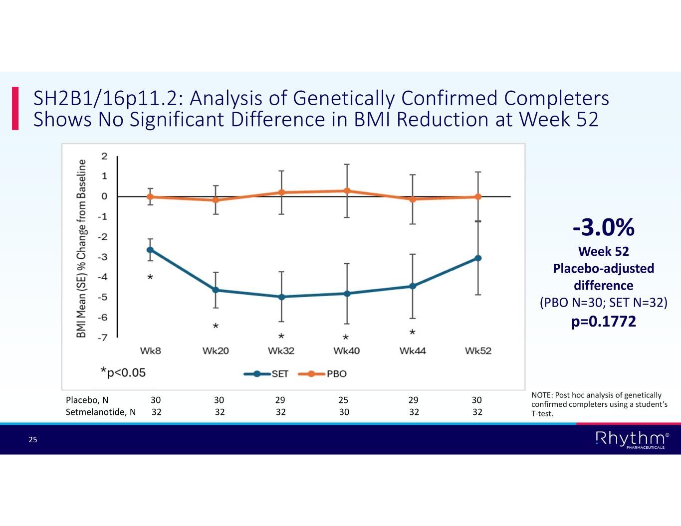 ® 23 SRC1 (NCOA1): Analysis of Genetically Confirmed Patients with Variants in Critical Protein Binding Domain Demonstrate Compelling Response -12.7% Week 52 placebo-adjusted difference (PBO N=6; SET N=6) p=0.055 Placebo, N 9 9 8 7 6 6 Setmelanotide, N 10 9 8 5 6 6 NOTE: Post hoc analysis of genetically confirmed completers using a student’s T-test.