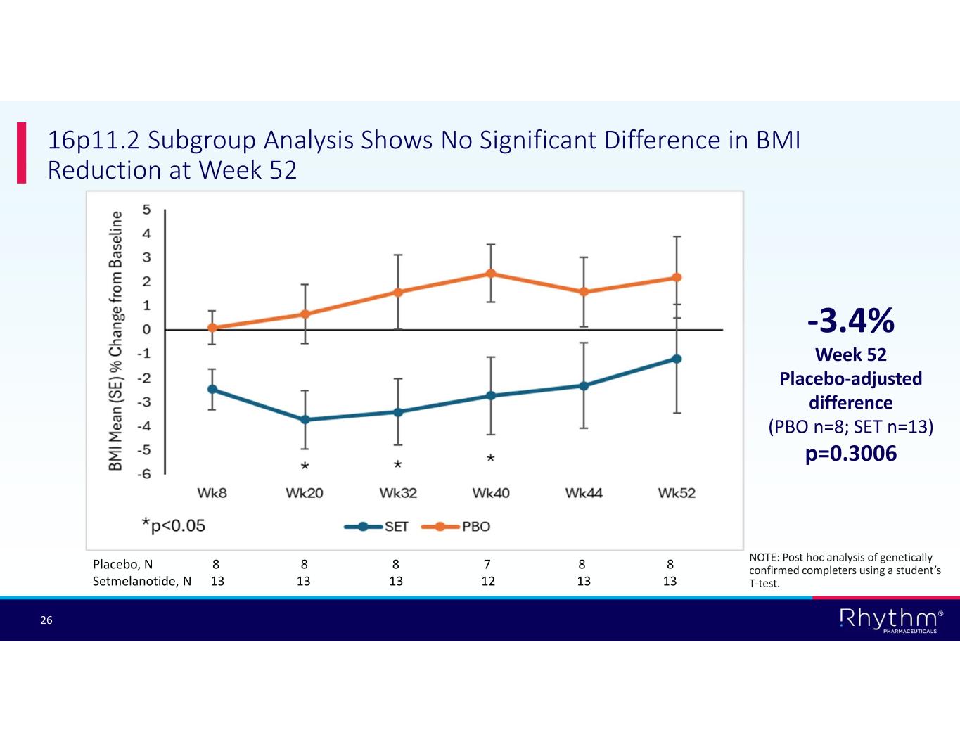 ® 25 SH2B1/16p11.2: Analysis of Genetically Confirmed Completers Shows No Significant Difference in BMI Reduction at Week 52 -3.0% Week 52 Placebo-adjusted difference (PBO N=30; SET N=32) p=0.1772 Placebo, N 30 30 29 25 29 30 Setmelanotide, N 32 32 32 30 32 32 NOTE: Post hoc analysis of genetically confirmed completers using a student’s T-test.