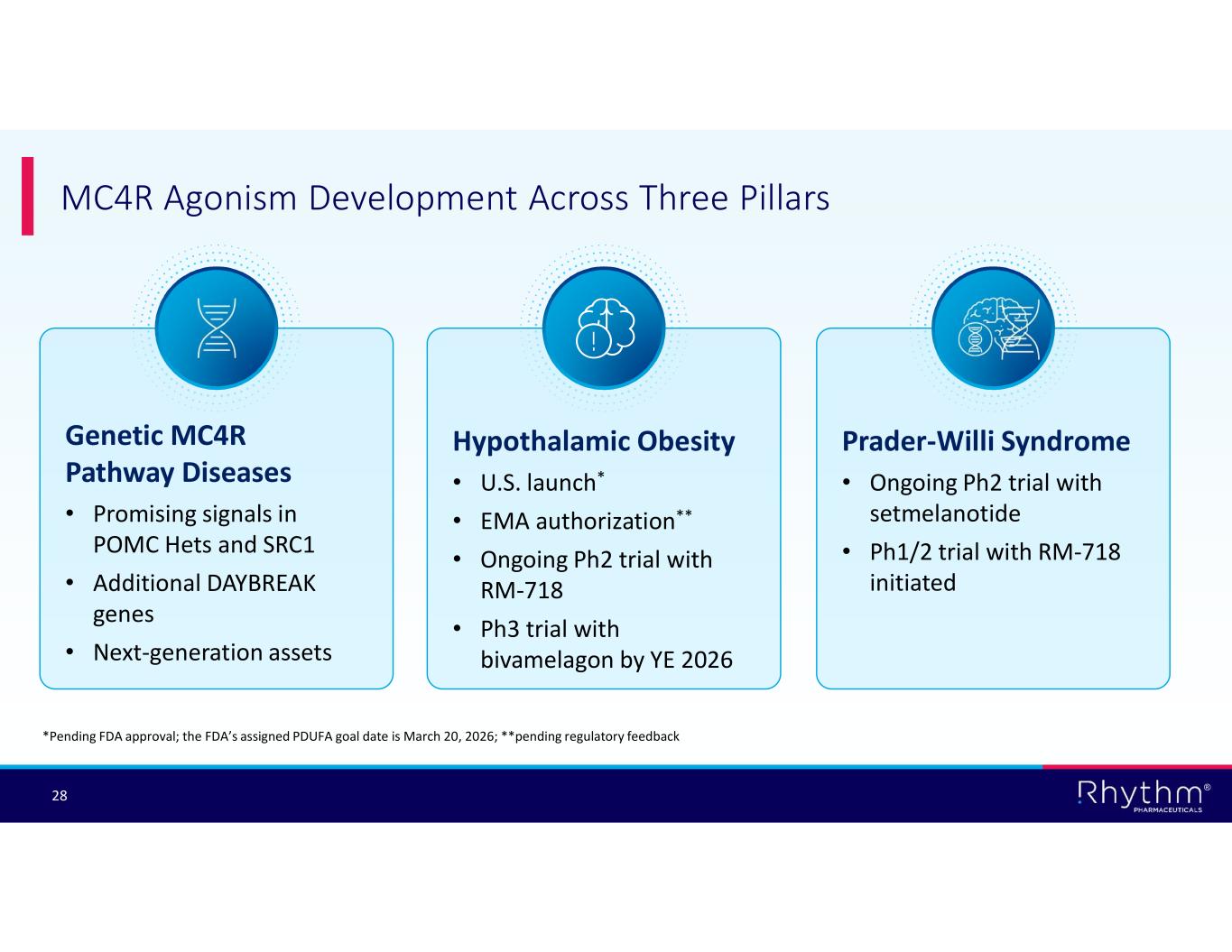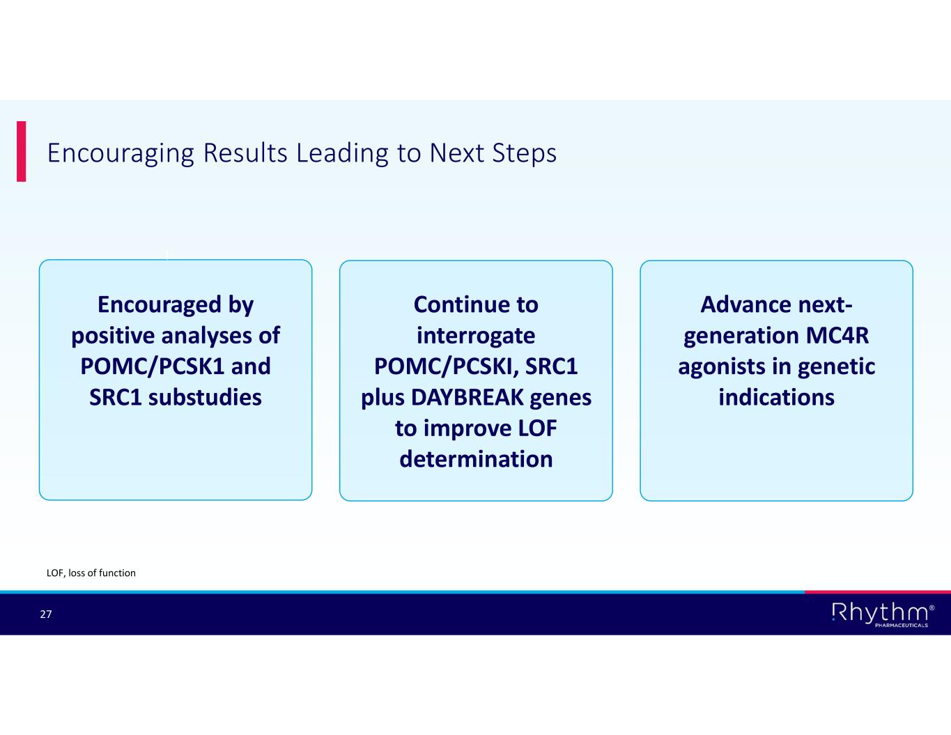 ® 27 Encouraging Results Leading to Next Steps Encouraged by positive analyses of POMC/PCSK1 and SRC1 substudies Continue to interrogate POMC/PCSKI, SRC1 plus DAYBREAK genes to improve LOF determination Advance next- generation MC4R agonists in genetic indications LOF, loss of function