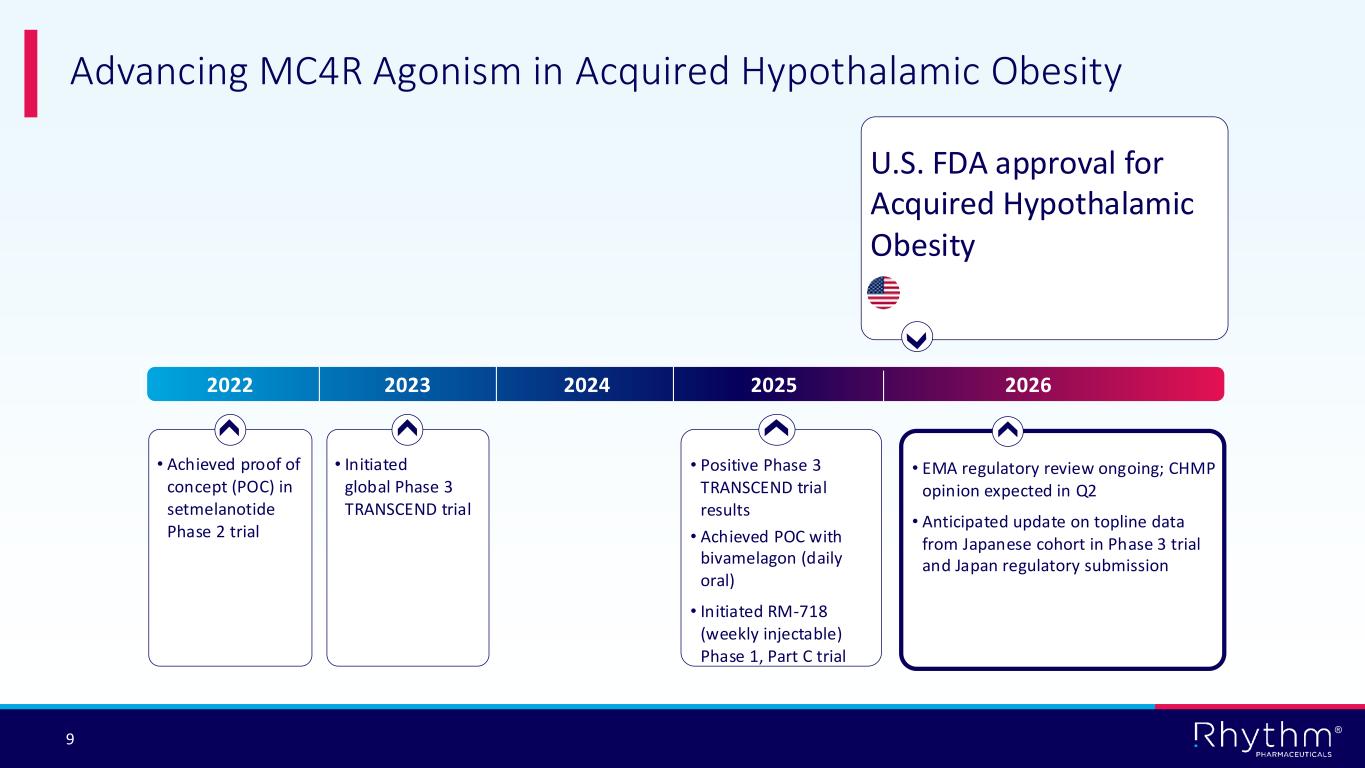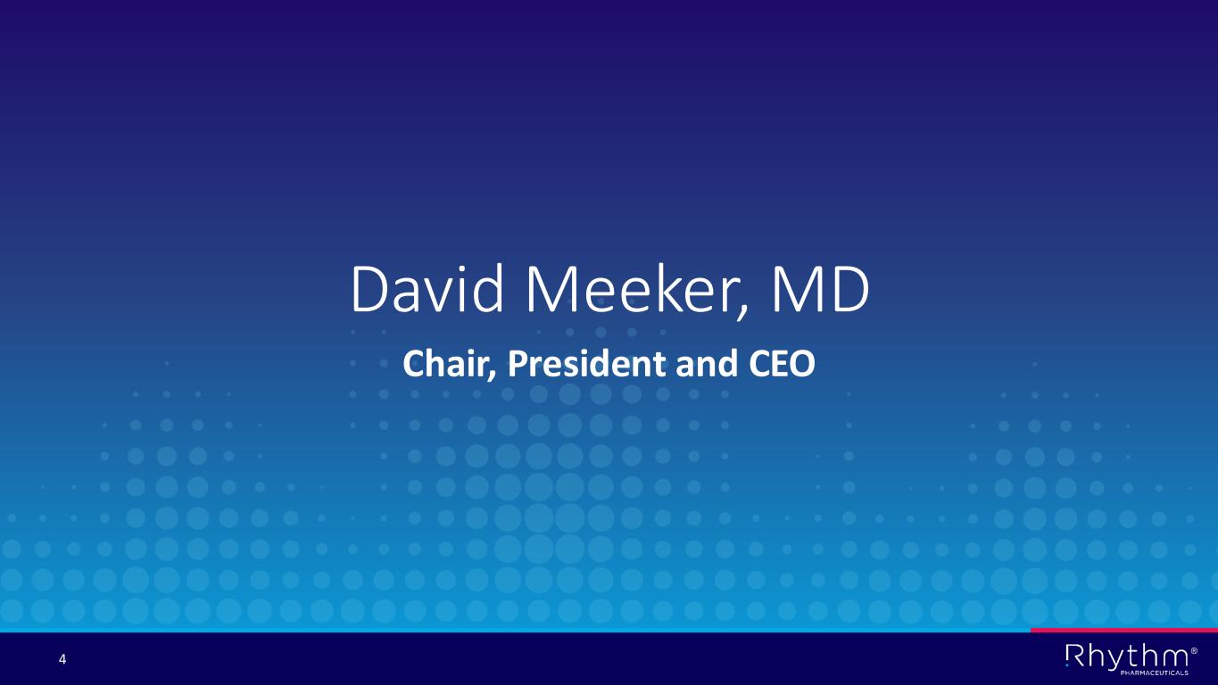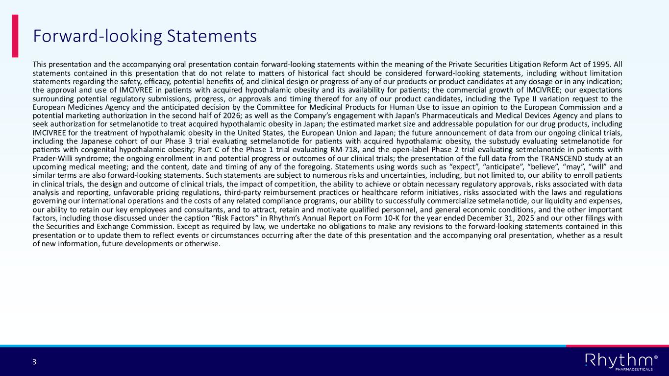 ® 3 This presentation and the accompanying oral presentation contain forward-looking statements within the meaning of the Private Securities Litigation Reform Act of 1995. All statements contained in this presentation that do not relate to matters of historical fact should be considered forward-looking statements, including without limitation statements regarding the safety, efficacy, potential benefits of, and clinical design or progress of any of our products or product candidates at any dosage or in any indication; the approval and use of IMCIVREE in patients with acquired hypothalamic obesity and its availability for patients; the commercial growth of IMCIVREE; our expectations surrounding potential regulatory submissions, progress, or approvals and timing thereof for any of our product candidates, including the Type II variation request to the European Medicines Agency and the anticipated decision by the Committee for Medicinal Products for Human Use to issue an opinion to the European Commission and a potential marketing authorization in the second half of 2026; as well as the Company’s engagement with Japan’s Pharmaceuticals and Medical Devices Agency and plans to seek authorization for setmelanotide to treat acquired hypothalamic obesity in Japan; the estimated market size and addressable population for our drug products, including IMCIVREE for the treatment of hypothalamic obesity in the United States, the European Union and Japan; the future announcement of data from our ongoing clinical trials, including the Japanese cohort of our Phase 3 trial evaluating setmelanotide for patients with acquired hypothalamic obesity, the substudy evaluating setmelanotide for patients with congenital hypothalamic obesity; Part C of the Phase 1 trial evaluating RM-718, and the open-label Phase 2 trial evaluating setmelanotide in patients with Prader-Willi syndrome; the ongoing enrollment in and potential progress or outcomes of our clinical trials; the presentation of the full data from the TRANSCEND study at an upcoming medical meeting; and the content, date and timing of any of the foregoing. Statements using words such as “expect”, “anticipate”, “believe”, “may”, “will” and similar terms are also forward-looking statements. Such statements are subject to numerous risks and uncertainties, including, but not limited to, our ability to enroll patients in clinical trials, the design and outcome of clinical trials, the impact of competition, the ability to achieve or obtain necessary regulatory approvals, risks associated with data analysis and reporting, unfavorable pricing regulations, third-party reimbursement practices or healthcare reform initiatives, risks associated with the laws and regulations governing our international operations and the costs of any related compliance programs, our ability to successfully commercialize setmelanotide, our liquidity and expenses, our ability to retain our key employees and consultants, and to attract, retain and motivate qualified personnel, and general economic conditions, and the other important factors, including those discussed under the caption “Risk Factors” in Rhythm’s Annual Report on Form 10-K for the year ended December 31, 2025 and our other filings with the Securities and Exchange Commission. Except as required by law, we undertake no obligations to make any revisions to the forward-looking statements contained in this presentation or to update them to reflect events or circumstances occurring after the date of this presentation and the accompanying oral presentation, whether as a result of new information, future developments or otherwise. Forward-looking Statements