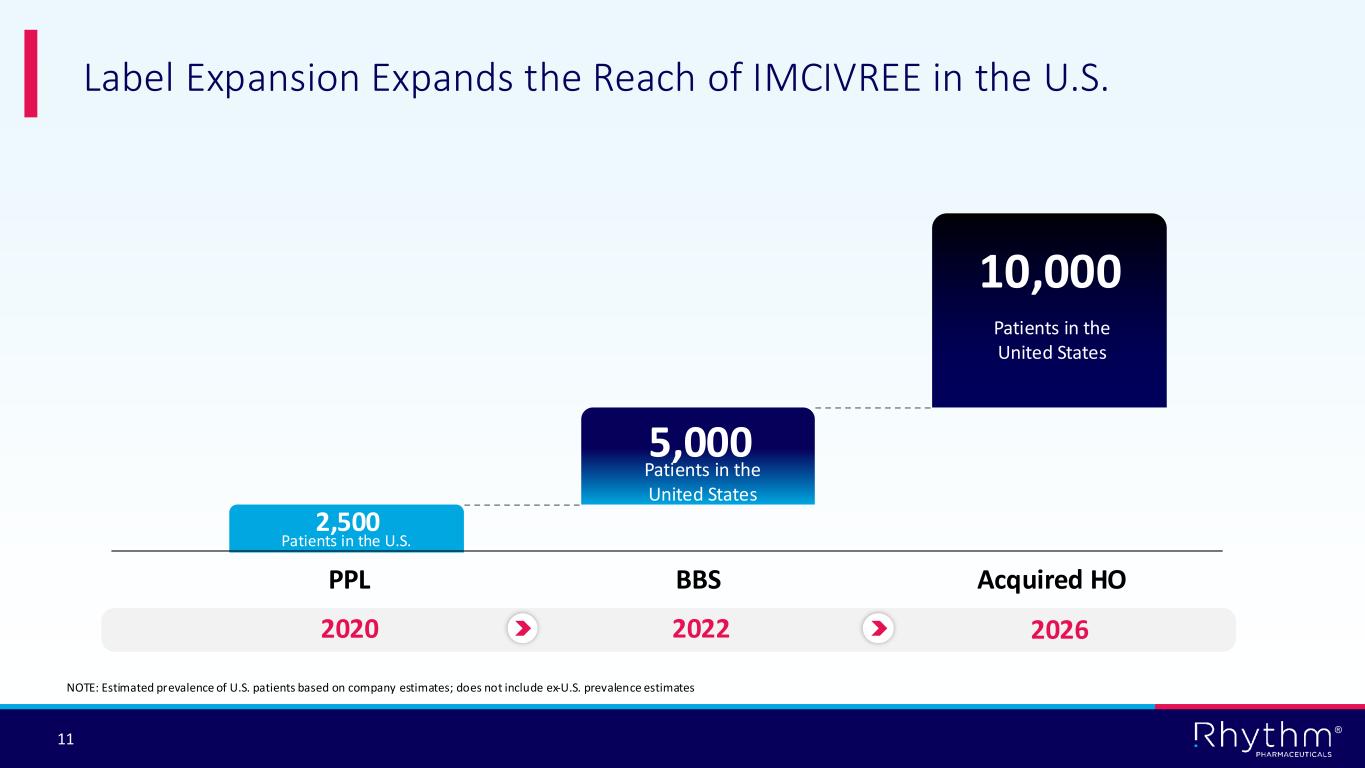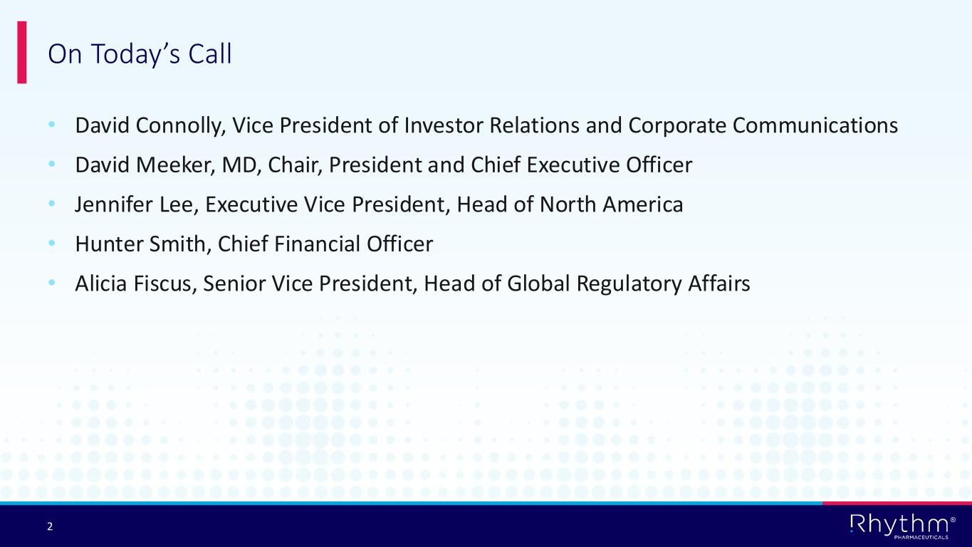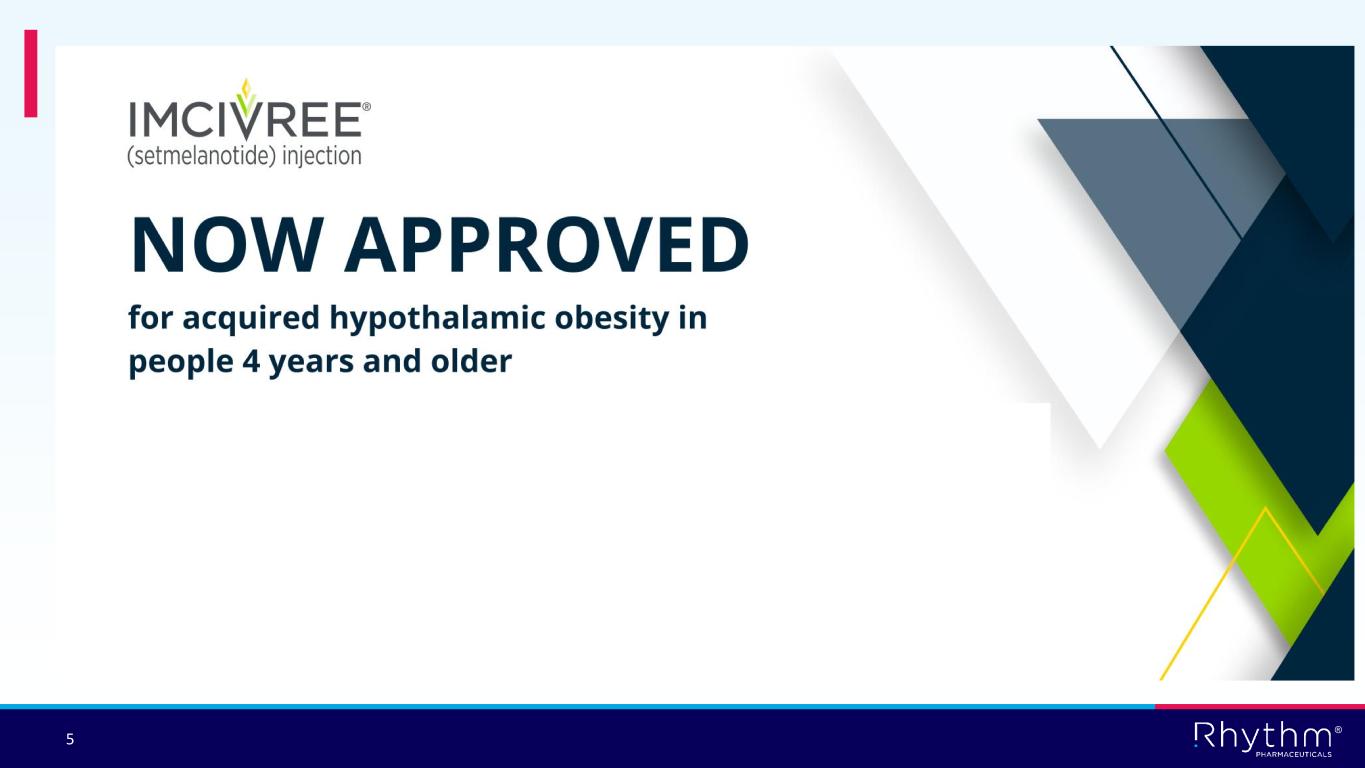 ® 3 This presentation and the accompanying oral presentation contain forward-looking statements within the meaning of the Private Securities Litigation Reform Act of 1995. All statements contained in this presentation that do not relate to matters of historical fact should be considered forward-looking statements, including without limitation statements regarding the safety, efficacy, potential benefits of, and clinical design or progress of any of our products or product candidates at any dosage or in any indication; the approval and use of IMCIVREE in patients with acquired hypothalamic obesity and its availability for patients; the commercial growth of IMCIVREE; our expectations surrounding potential regulatory submissions, progress, or approvals and timing thereof for any of our product candidates, including the Type II variation request to the European Medicines Agency and the anticipated decision by the Committee for Medicinal Products for Human Use to issue an opinion to the European Commission and a potential marketing authorization in the second half of 2026; as well as the Company’s engagement with Japan’s Pharmaceuticals and Medical Devices Agency and plans to seek authorization for setmelanotide to treat acquired hypothalamic obesity in Japan; the estimated market size and addressable population for our drug products, including IMCIVREE for the treatment of hypothalamic obesity in the United States, the European Union and Japan; the future announcement of data from our ongoing clinical trials, including the Japanese cohort of our Phase 3 trial evaluating setmelanotide for patients with acquired hypothalamic obesity, the substudy evaluating setmelanotide for patients with congenital hypothalamic obesity; Part C of the Phase 1 trial evaluating RM-718, and the open-label Phase 2 trial evaluating setmelanotide in patients with Prader-Willi syndrome; the ongoing enrollment in and potential progress or outcomes of our clinical trials; the presentation of the full data from the TRANSCEND study at an upcoming medical meeting; and the content, date and timing of any of the foregoing. Statements using words such as “expect”, “anticipate”, “believe”, “may”, “will” and similar terms are also forward-looking statements. Such statements are subject to numerous risks and uncertainties, including, but not limited to, our ability to enroll patients in clinical trials, the design and outcome of clinical trials, the impact of competition, the ability to achieve or obtain necessary regulatory approvals, risks associated with data analysis and reporting, unfavorable pricing regulations, third-party reimbursement practices or healthcare reform initiatives, risks associated with the laws and regulations governing our international operations and the costs of any related compliance programs, our ability to successfully commercialize setmelanotide, our liquidity and expenses, our ability to retain our key employees and consultants, and to attract, retain and motivate qualified personnel, and general economic conditions, and the other important factors, including those discussed under the caption “Risk Factors” in Rhythm’s Annual Report on Form 10-K for the year ended December 31, 2025 and our other filings with the Securities and Exchange Commission. Except as required by law, we undertake no obligations to make any revisions to the forward-looking statements contained in this presentation or to update them to reflect events or circumstances occurring after the date of this presentation and the accompanying oral presentation, whether as a result of new information, future developments or otherwise. Forward-looking Statements