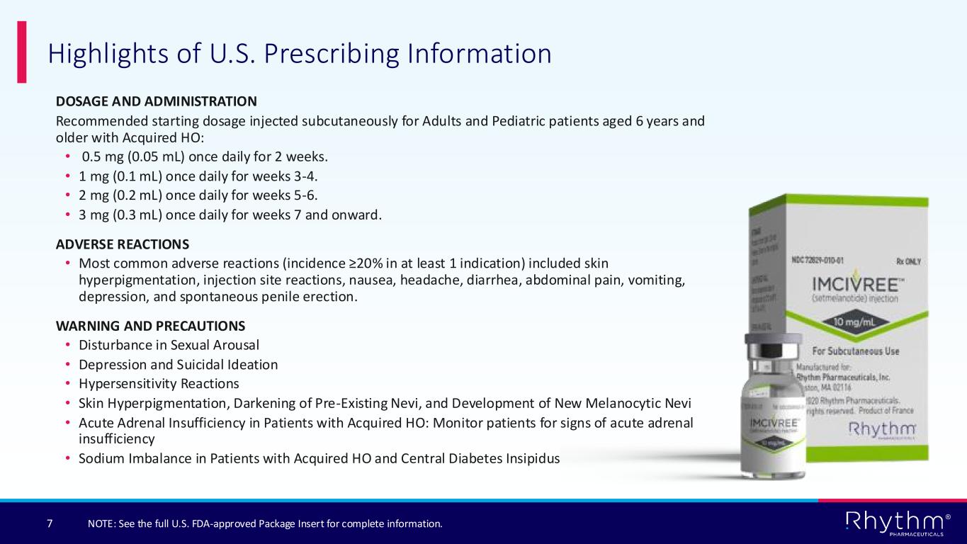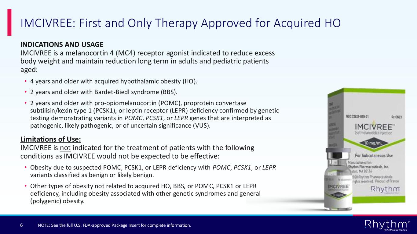 ® 6 INDICATIONS AND USAGE IMCIVREE is a melanocortin 4 (MC4) receptor agonist indicated to reduce excess body weight and maintain reduction long term in adults and pediatric patients aged: • 4 years and older with acquired hypothalamic obesity (HO). • 2 years and older with Bardet-Biedl syndrome (BBS). • 2 years and older with pro-opiomelanocortin (POMC), proprotein convertase subtilisin/kexin type 1 (PCSK1), or leptin receptor (LEPR) deficiency confirmed by genetic testing demonstrating variants in POMC, PCSK1, or LEPR genes that are interpreted as pathogenic, likely pathogenic, or of uncertain significance (VUS). Limitations of Use: IMCIVREE is not indicated for the treatment of patients with the following conditions as IMCIVREE would not be expected to be effective: • Obesity due to suspected POMC, PCSK1, or LEPR deficiency with POMC, PCSK1, or LEPR variants classified as benign or likely benign. • Other types of obesity not related to acquired HO, BBS, or POMC, PCSK1 or LEPR deficiency, including obesity associated with other genetic syndromes and general (polygenic) obesity. IMCIVREE: First and Only Therapy Approved for Acquired HO NOTE: See the full U.S. FDA-approved Package Insert for complete information.