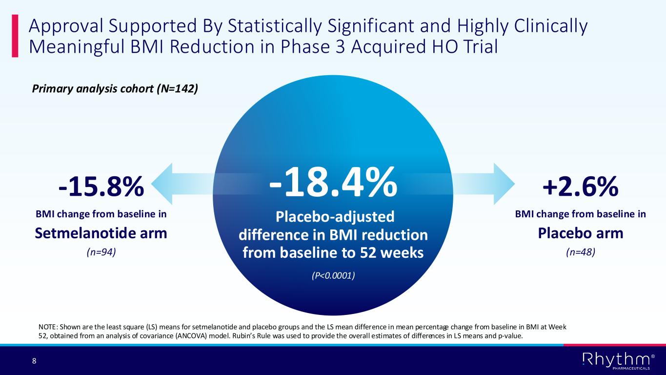 ® 8 Approval Supported By Statistically Significant and Highly Clinically Meaningful BMI Reduction in Phase 3 Acquired HO Trial Primary analysis cohort (N=142) -18.4% Placebo-adjusted difference in BMI reduction from baseline to 52 weeks (P<0.0001) -15.8% BMI change from baseline in Setmelanotide arm (n=94) +2.6% BMI change from baseline in Placebo arm (n=48) NOTE: Shown are the least square (LS) means for setmelanotide and placebo groups and the LS mean difference in mean percentage change from baseline in BMI at Week 52, obtained from an analysis of covariance (ANCOVA) model. Rubin’s Rule was used to provide the overall estimates of differences in LS means and p-value.