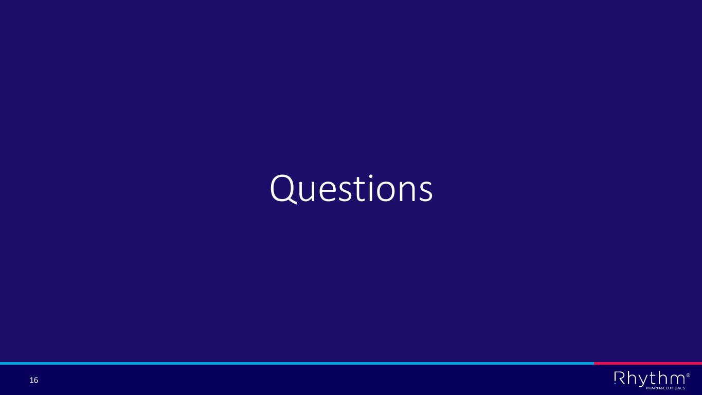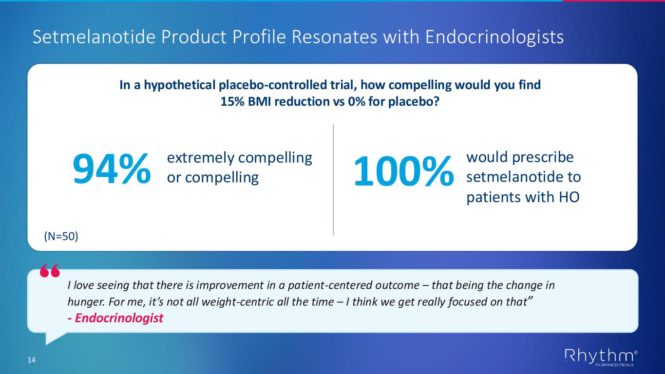 ® 14 Setmelanotide Product Profile Resonates with Endocrinologists In a hypothetical placebo-controlled trial, how compelling would you find 15% BMI reduction vs 0% for placebo? I love seeing that there is improvement in a patient-centered outcome – that being the change in hunger. For me, it’s not all weight-centric all the time – I think we get really focused on that” - Endocrinologist 94% 100% (N=50) extremely compelling or compelling would prescribe setmelanotide to patients with HO