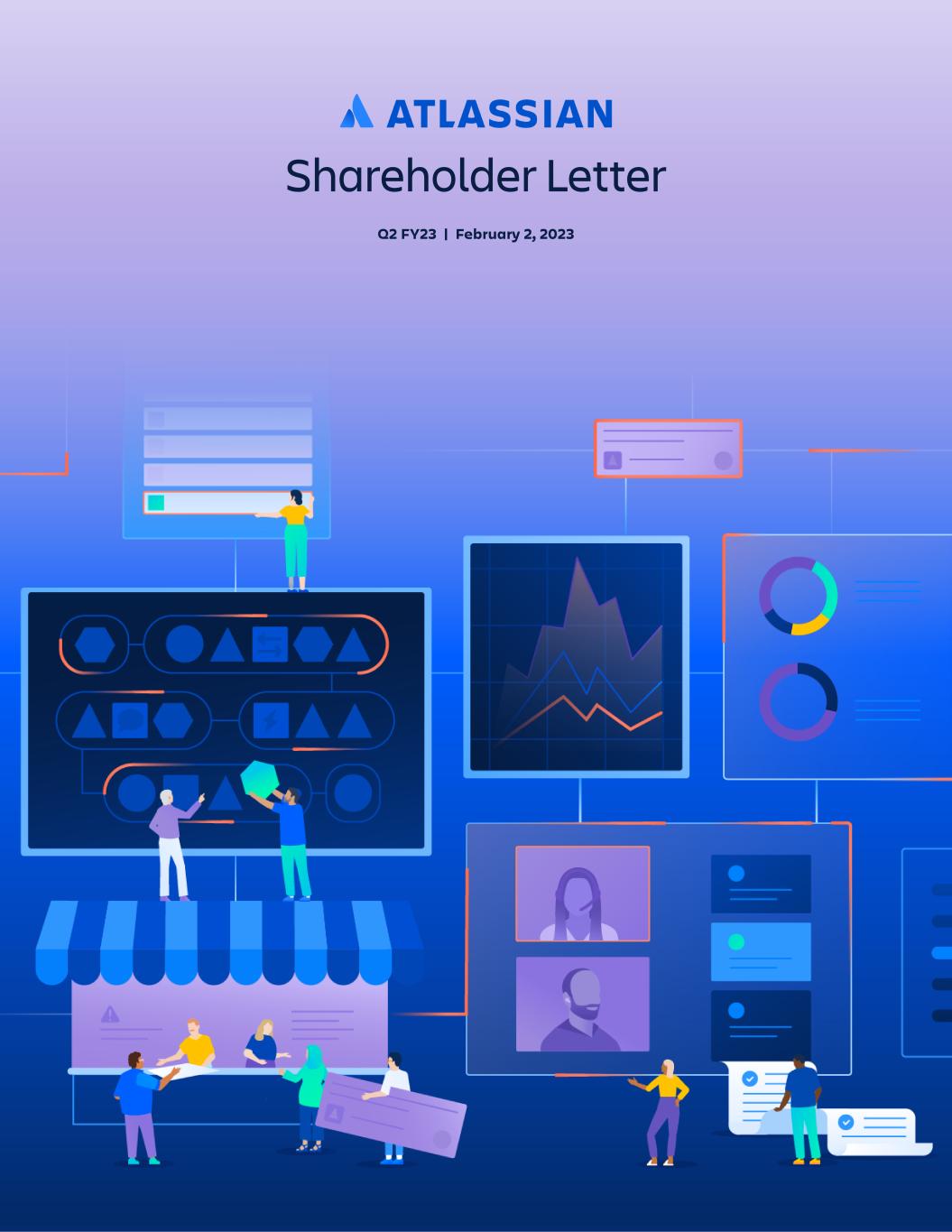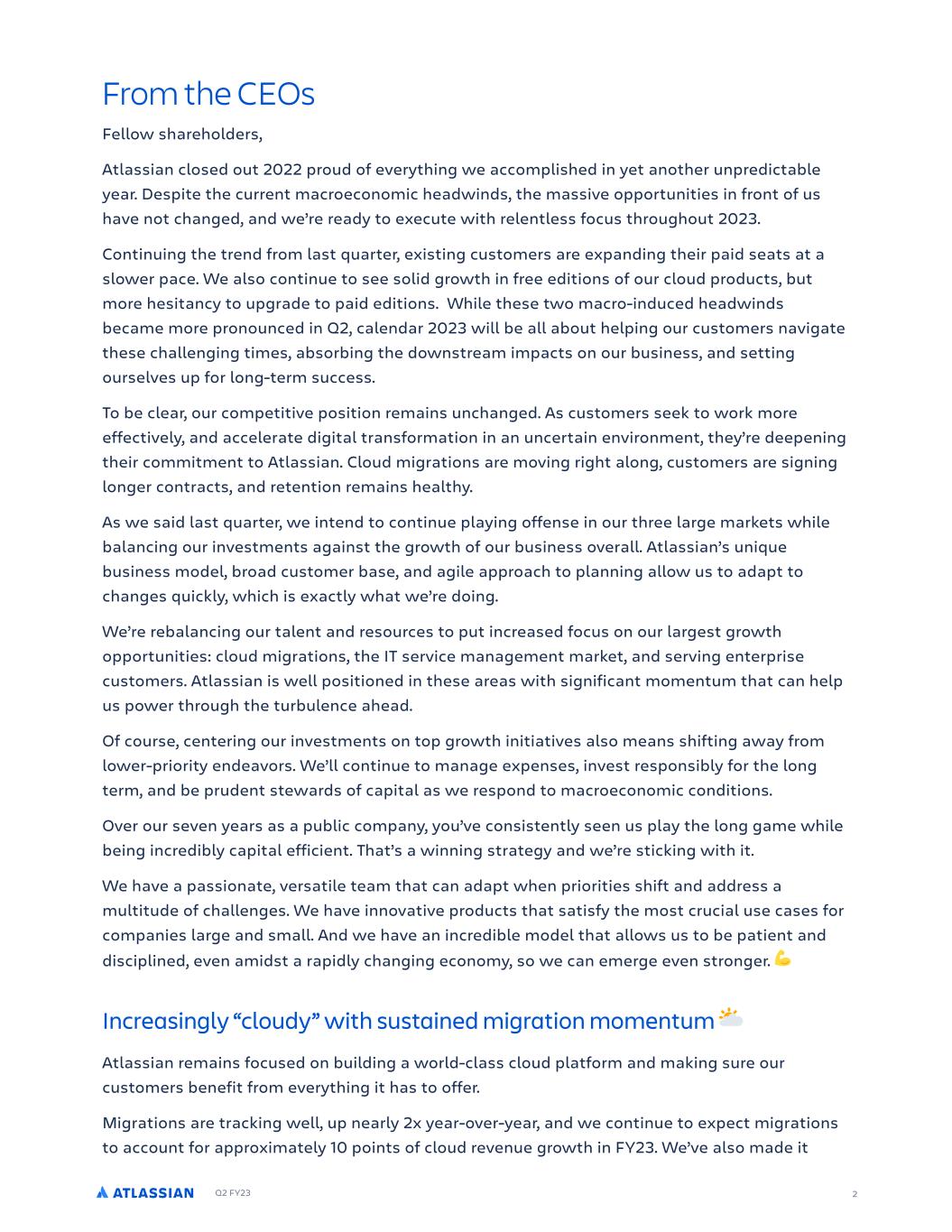 Q2 FY23 From the CEOs 2 Fellow sh!reholders, Atl!ssi!n closed out 2022 proud of everything we !ccomplished in yet !nother unpredict!ble ye!r. Despite the current m!croeconomic he!dwinds, the m!ssive opportunities in front of us h!ve not ch!nged, !nd we’re re!dy to execute with relentless focus throughout 2023. Continuing the trend from l!st qu!rter, existing customers !re exp!nding their p!id se!ts !t ! slower p!ce. We !lso continue to see solid growth in free editions of our cloud products, but more hesit!ncy to upgr!de to p!id editions. While these two m!cro-induced he!dwinds bec!me more pronounced in Q2, c!lend!r 2023 will be !ll !bout helping our customers n!vig!te these ch!llenging times, !bsorbing the downstre!m imp!cts on our business, !nd setting ourselves up for long-term success. To be cle!r, our competitive position rem!ins unch!nged. As customers seek to work more effectively, !nd !cceler!te digit!l tr!nsform!tion in !n uncert!in environment, they’re deepening their commitment to Atl!ssi!n. Cloud migr!tions !re moving right !long, customers !re signing longer contr!cts, !nd retention rem!ins he!lthy. As we s!id l!st qu!rter, we intend to continue pl!ying offense in our three l!rge m!rkets while b!l!ncing our investments !g!inst the growth of our business over!ll. Atl!ssi!n’s unique business model, bro!d customer b!se, !nd !gile !ppro!ch to pl!nning !llow us to !d!pt to ch!nges quickly, which is ex!ctly wh!t we’re doing. We’re reb!l!ncing our t!lent !nd resources to put incre!sed focus on our l!rgest growth opportunities: cloud migr!tions, the IT service m!n!gement m!rket, !nd serving enterprise customers. Atl!ssi!n is well positioned in these !re!s with signific!nt momentum th!t c!n help us power through the turbulence !he!d. Of course, centering our investments on top growth initi!tives !lso me!ns shifting !w!y from lower-priority ende!vors. We’ll continue to m!n!ge expenses, invest responsibly for the long term, !nd be prudent stew!rds of c!pit!l !s we respond to m!croeconomic conditions. Over our seven ye!rs !s ! public comp!ny, you’ve consistently seen us pl!y the long g!me while being incredibly c!pit!l efficient. Th!t’s ! winning str!tegy !nd we’re sticking with it. We h!ve ! p!ssion!te, vers!tile te!m th!t c!n !d!pt when priorities shift !nd !ddress ! multitude of ch!llenges. We h!ve innov!tive products th!t s!tisfy the most cruci!l use c!ses for comp!nies l!rge !nd sm!ll. And we h!ve !n incredible model th!t !llows us to be p!tient !nd disciplined, even !midst ! r!pidly ch!nging economy, so we c!n emerge even stronger. Increasingly “cloudy” with sustained migration momentum Atl!ssi!n rem!ins focused on building ! world-cl!ss cloud pl!tform !nd m!king sure our customers benefit from everything it h!s to offer. Migr!tions !re tr!cking well, up ne!rly 2x ye!r-over-ye!r, !nd we continue to expect migr!tions to !ccount for !pproxim!tely 10 points of cloud revenue growth in FY23. We’ve !lso m!de it
