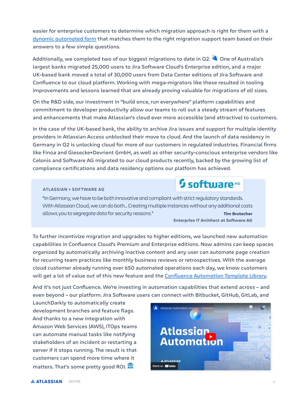Q2 FY23 3 e!sier for enterprise customers to determine which migr!tion !ppro!ch is right for them with ! dynamic automated form th!t m!tches them to the right migr!tion support te!m b!sed on their !nswers to ! few simple questions. Addition!lly, we completed two of our biggest migr!tions to d!te in Q2. One of Austr!li!’s l!rgest b!nks migr!ted 25,000 users to Jir! Softw!re Cloud’s Enterprise edition, !nd ! m!jor UK-b!sed b!nk moved ! tot!l of 30,000 users from D!t! Center editions of Jir! Softw!re !nd Confluence to our cloud pl!tform. Working with meg!-migr!tors like these resulted in tooling improvements !nd lessons le!rned th!t !re !lre!dy proving v!lu!ble for migr!tions of all sizes. On the R&D side, our investment in “build once, run everywhere” pl!tform c!p!bilities !nd commitment to developer productivity !llow our te!ms to roll out ! ste!dy stre!m of fe!tures !nd enh!ncements th!t m!ke Atl!ssi!n’s cloud ever more !ccessible (!nd !ttr!ctive) to customers. In the c!se of the UK-b!sed b!nk, the !bility to !rchive Jir! issues !nd support for multiple identity providers in Atl!ssi!n Access unblocked their move to cloud. And the l!unch of d!t! residency in Germ!ny in Q2 is unlocking cloud for more of our customers in regul!ted industries. Fin!nci!l firms like Fino! !nd Giesecke+Devrient GmbH, !s well !s other security-conscious enterprise vendors like Celonis !nd Softw!re AG migr!ted to our cloud products recently, b!cked by the growing list of compli!nce certific!tions !nd d!t! residency options our pl!tform h!s !chieved. To further incentivize migr!tion !nd upgr!des to higher editions, we l!unched new !utom!tion c!p!bilities in Confluence Cloud’s Premium !nd Enterprise editions. Now !dmins c!n keep sp!ces org!nized by !utom!tic!lly !rchiving in!ctive content !nd !ny user c!n !utom!te p!ge cre!tion for recurring te!m pr!ctices like monthly business reviews or retrospectives. With the !ver!ge cloud customer !lre!dy running over 650 !utom!ted oper!tions e!ch d!y, we know customers will get ! lot of v!lue out of this new fe!ture !nd the Confluence Automation Template Library. And it’s not just Confluence. We’re investing in !utom!tion c!p!bilities th!t extend !cross – !nd even beyond – our pl!tform. Jir! Softw!re users c!n connect with Bitbucket, GitHub, GitL!b, !nd L!unchD!rkly to !utom!tic!lly cre!te development br!nches !nd fe!ture fl!gs. And th!nks to ! new integr!tion with Am!zon Web Services (AWS), ITOps te!ms c!n !utom!te m!nu!l t!sks like notifying st!keholders of !n incident or rest!rting ! server if it stops running. The result is th!t customers c!n spend more time where it m!tters. Th!t’s some pretty good ROI. ATLASSIAN + SOFT WARE AG “In Germany, we have to be both innovative and compliant with strict regulatory standards. With Atlassian Cloud, we can do both… Creating multiple instances without any additional costs allows you to segregate data for security reasons.” Tim Brutscher Enterprise IT Architect at Software AG