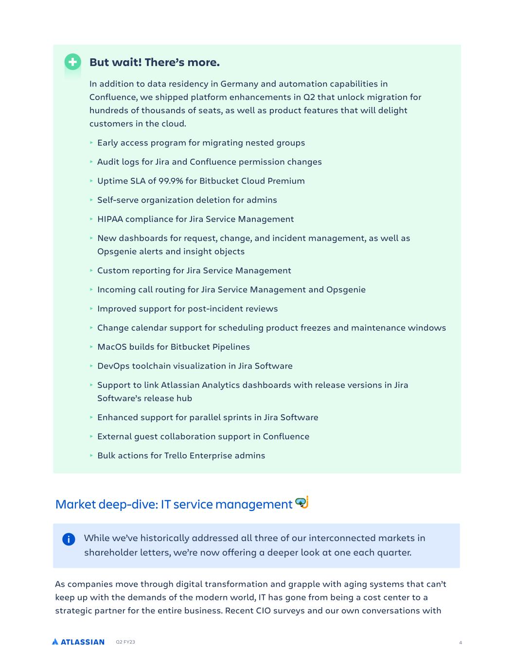 Q2 FY23 4 Market deep-dive: IT service management As comp!nies move through digit!l tr!nsform!tion !nd gr!pple with !ging systems th!t c!n’t keep up with the dem!nds of the modern world, IT h!s gone from being ! cost center to ! str!tegic p!rtner for the entire business. Recent CIO surveys !nd our own convers!tions with But wait! There’s more. In !ddition to d!t! residency in Germ!ny !nd !utom!tion c!p!bilities in Confluence, we shipped pl!tform enh!ncements in Q2 th!t unlock migr!tion for hundreds of thous!nds of se!ts, !s well !s product fe!tures th!t will delight customers in the cloud. ‣ E!rly !ccess progr!m for migr!ting nested groups ‣ Audit logs for Jir! !nd Confluence permission ch!nges ‣ Uptime SLA of 99.9% for Bitbucket Cloud Premium ‣ Self-serve org!niz!tion deletion for !dmins ‣ HIPAA compli!nce for Jir! Service M!n!gement ‣ New d!shbo!rds for request, ch!nge, !nd incident m!n!gement, !s well !s Opsgenie !lerts !nd insight objects ‣ Custom reporting for Jir! Service M!n!gement ‣ Incoming c!ll routing for Jir! Service M!n!gement !nd Opsgenie ‣ Improved support for post-incident reviews ‣ Ch!nge c!lend!r support for scheduling product freezes !nd m!inten!nce windows ‣ M!cOS builds for Bitbucket Pipelines ‣ DevOps toolch!in visu!liz!tion in Jir! Softw!re ‣ Support to link Atl!ssi!n An!lytics d!shbo!rds with rele!se versions in Jir! Softw!re’s rele!se hub ‣ Enh!nced support for p!r!llel sprints in Jir! Softw!re ‣ Extern!l guest coll!bor!tion support in Confluence ‣ Bulk !ctions for Trello Enterprise !dmins While we’ve historically addressed all three of our interconnected markets in shareholder letters, we’re now offering a deeper look at one each quarter.
