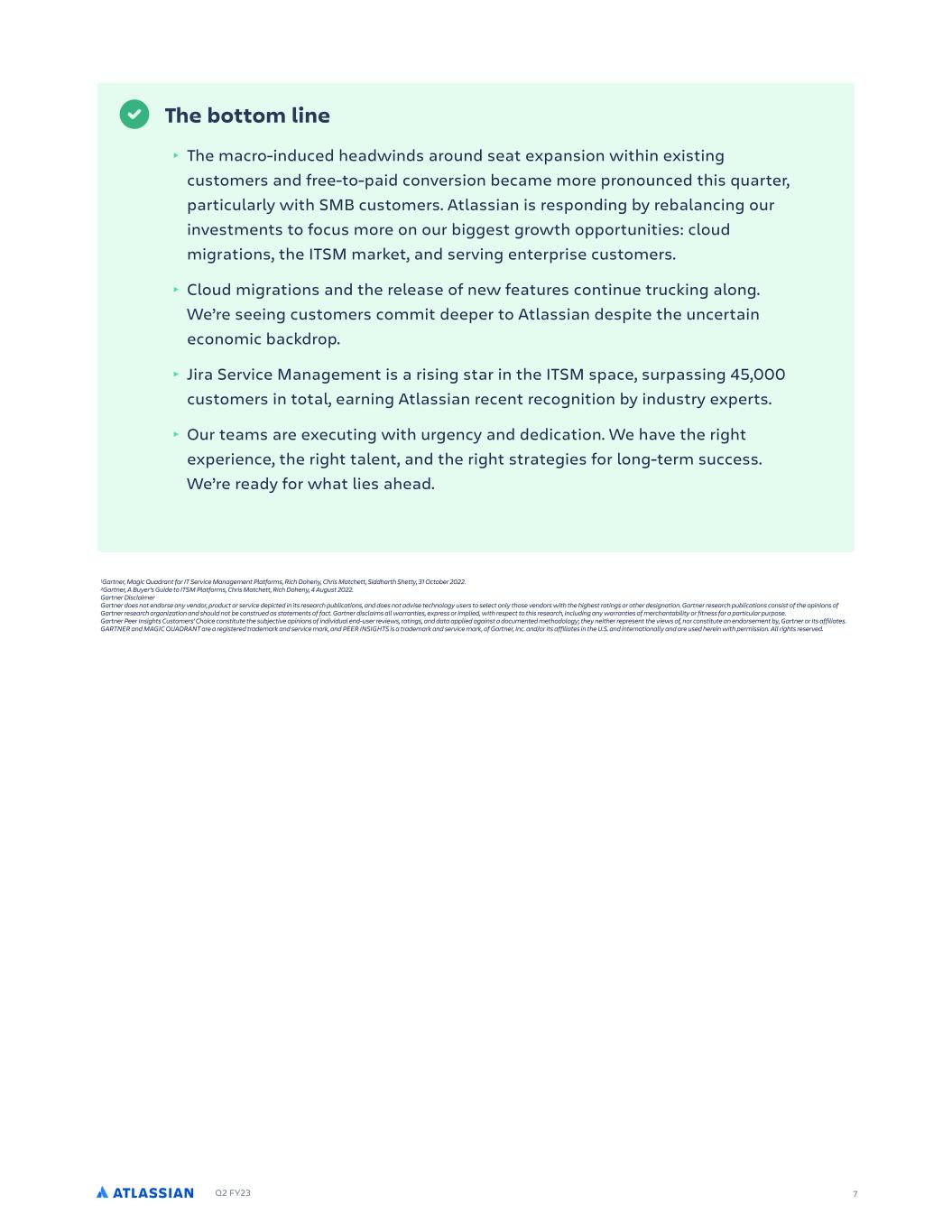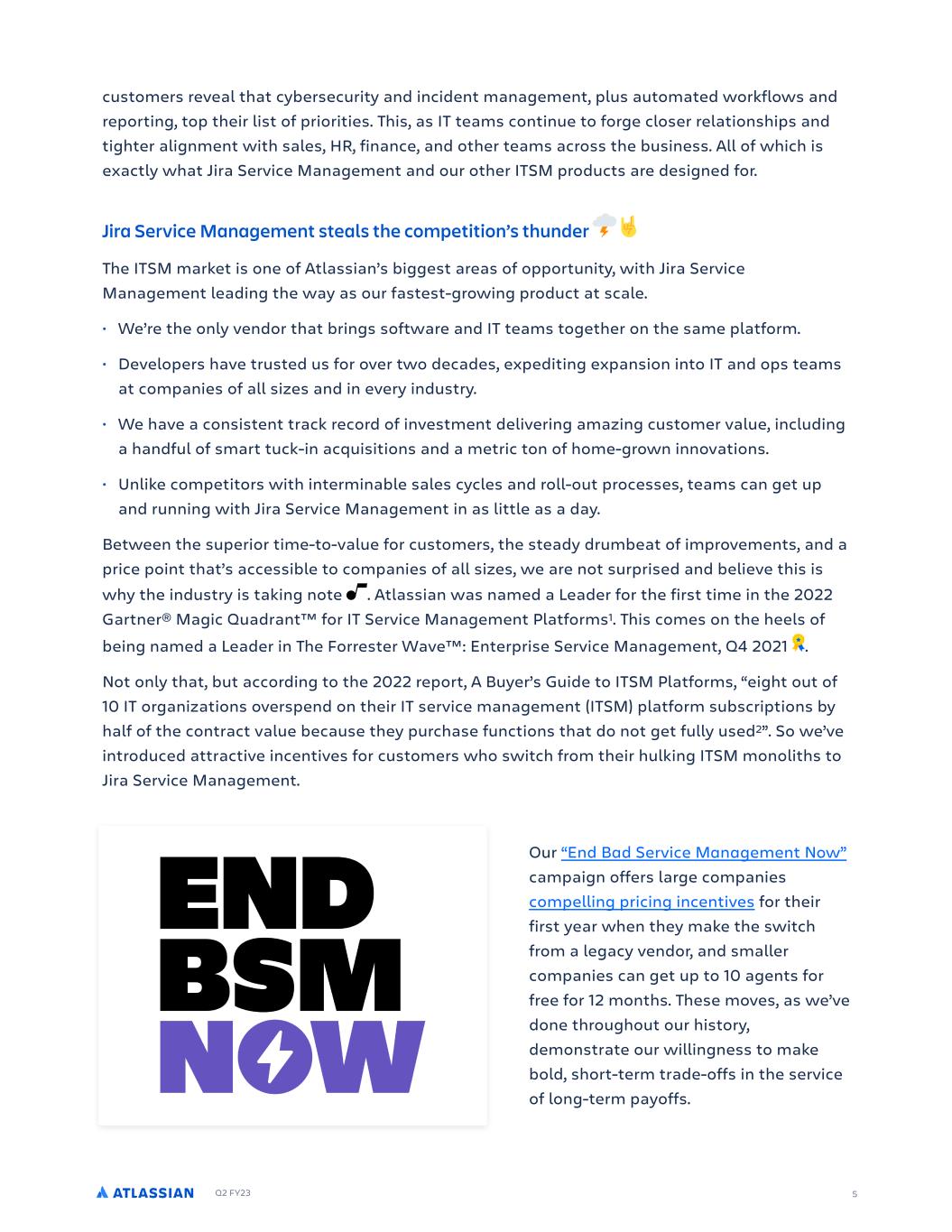 Q2 FY23 5 customers reve!l th!t cybersecurity !nd incident m!n!gement, plus !utom!ted workflows !nd reporting, top their list of priorities. This, !s IT te!ms continue to forge closer rel!tionships !nd tighter !lignment with s!les, HR, fin!nce, !nd other te!ms !cross the business. All of which is ex!ctly wh!t Jir! Service M!n!gement !nd our other ITSM products !re designed for. Jira Service Management steals the competition’s thunder The ITSM m!rket is one of Atl!ssi!n’s biggest !re!s of opportunity, with Jir! Service M!n!gement le!ding the w!y !s our f!stest-growing product !t sc!le. • We’re the only vendor th!t brings softw!re !nd IT te!ms together on the s!me pl!tform. • Developers h!ve trusted us for over two dec!des, expediting exp!nsion into IT !nd ops te!ms !t comp!nies of !ll sizes !nd in every industry. • We h!ve ! consistent tr!ck record of investment delivering !m!zing customer v!lue, including ! h!ndful of sm!rt tuck-in !cquisitions !nd ! metric ton of home-grown innov!tions. • Unlike competitors with intermin!ble s!les cycles !nd roll-out processes, te!ms c!n get up !nd running with Jir! Service M!n!gement in !s little !s ! d!y. Between the superior time-to-v!lue for customers, the ste!dy drumbe!t of improvements, !nd ! price point th!t’s !ccessible to comp!nies of !ll sizes, we !re not surprised !nd believe this is why the industry is t!king note . Atl!ssi!n w!s n!med ! Le!der for the first time in the 2022 G!rtner® M!gic Qu!dr!nt™ for IT Service M!n!gement Pl!tforms1. This comes on the heels of being n!med ! Le!der in The Forrester W!ve™: Enterprise Service M!n!gement, Q4 2021 . Not only th!t, but !ccording to the 2022 report, A Buyer’s Guide to ITSM Pl!tforms, “eight out of 10 IT org!niz!tions overspend on their IT service m!n!gement (ITSM) pl!tform subscriptions by h!lf of the contr!ct v!lue bec!use they purch!se functions th!t do not get fully used2”. So we’ve introduced !ttr!ctive incentives for customers who switch from their hulking ITSM monoliths to Jir! Service M!n!gement. Our “End Bad Service Management Now” c!mp!ign offers l!rge comp!nies compelling pricing incentives for their first ye!r when they m!ke the switch from ! leg!cy vendor, !nd sm!ller comp!nies c!n get up to 10 !gents for free for 12 months. These moves, !s we’ve done throughout our history, demonstr!te our willingness to m!ke bold, short-term tr!de-offs in the service of long-term p!yoffs.