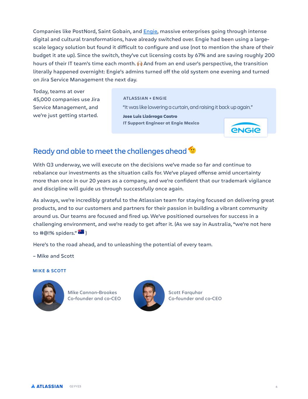 Q2 FY23 6 Comp!nies like PostNord, S!int Gob!in, !nd Engie, m!ssive enterprises going through intense digit!l !nd cultur!l tr!nsform!tions, h!ve !lre!dy switched over. Engie h!d been using ! l!rge- sc!le leg!cy solution but found it difficult to configure !nd use (not to mention the sh!re of their budget it !te up). Since the switch, they’ve cut licensing costs by 67% !nd !re s!ving roughly 200 hours of their IT te!m’s time e!ch month. ! And from !n end user’s perspective, the tr!nsition liter!lly h!ppened overnight: Engie’s !dmins turned off the old system one evening !nd turned on Jir! Service M!n!gement the next d!y. Ready and able to meet the challenges ahead With Q3 underw!y, we will execute on the decisions we’ve m!de so f!r !nd continue to reb!l!nce our investments !s the situ!tion c!lls for. We’ve pl!yed offense !mid uncert!inty more th!n once in our 20 ye!rs !s ! comp!ny, !nd we’re confident th!t our tr!dem!rk vigil!nce !nd discipline will guide us through successfully once !g!in. As !lw!ys, we’re incredibly gr!teful to the Atl!ssi!n te!m for st!ying focused on delivering gre!t products, !nd to our customers !nd p!rtners for their p!ssion in building ! vibr!nt community !round us. Our te!ms !re focused !nd fired up. We’ve positioned ourselves for success in ! ch!llenging environment, !nd we’re re!dy to get !fter it. (As we s!y in Austr!li!, “we’re not here to #@!% spiders.” ) Here’s to the ro!d !he!d, !nd to unle!shing the potenti!l of every te!m. – Mike !nd Scott Tod!y, te!ms !t over 45,000 comp!nies use Jir! Service M!n!gement, !nd we’re just getting st!rted. ATLASSIAN + ENGIE “It was like lowering a curtain, and raising it back up again.” Jose Luis Lizárraga Castro IT Support Engineer at Engie Mexico Mike Cannon-Brookes Co-founder and co-CEO Scott Farquhar Co-founder and co-CEO MIKE & SCOT T