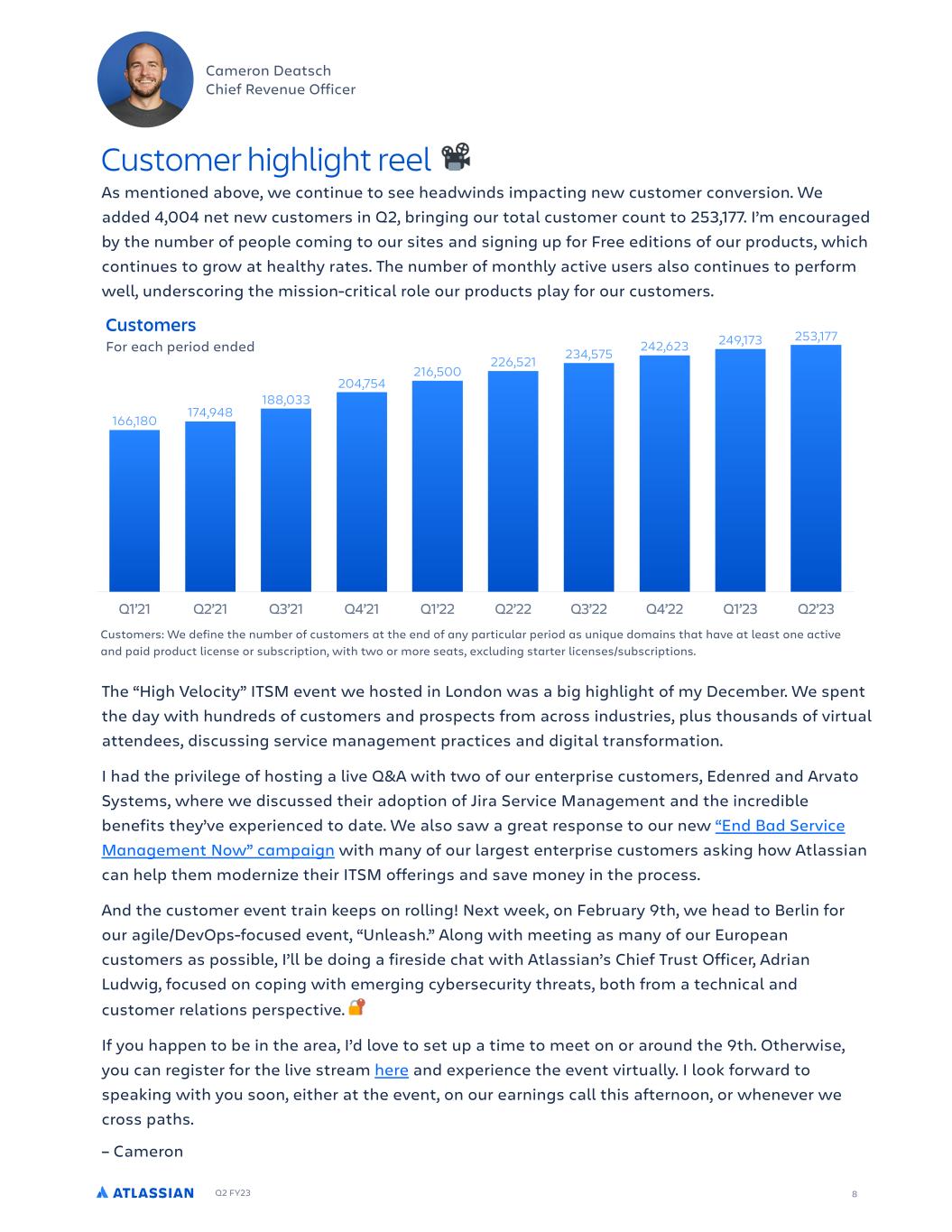 Q2 FY23 8 As mentioned !bove, we continue to see he!dwinds imp!cting new customer conversion. We !dded 4,004 net new customers in Q2, bringing our tot!l customer count to 253,177. I’m encour!ged by the number of people coming to our sites !nd signing up for Free editions of our products, which continues to grow !t he!lthy r!tes. The number of monthly !ctive users !lso continues to perform well, underscoring the mission-critic!l role our products pl!y for our customers. The “High Velocity” ITSM event we hosted in London w!s ! big highlight of my December. We spent the d!y with hundreds of customers !nd prospects from !cross industries, plus thous!nds of virtu!l !ttendees, discussing service m!n!gement pr!ctices !nd digit!l tr!nsform!tion. I h!d the privilege of hosting ! live Q&A with two of our enterprise customers, Edenred !nd Arv!to Systems, where we discussed their !doption of Jir! Service M!n!gement !nd the incredible benefits they’ve experienced to d!te. We !lso s!w ! gre!t response to our new “End Bad Service Management Now” campaign with m!ny of our l!rgest enterprise customers !sking how Atl!ssi!n c!n help them modernize their ITSM offerings !nd s!ve money in the process. And the customer event tr!in keeps on rolling! Next week, on Febru!ry 9th, we he!d to Berlin for our !gile/DevOps-focused event, “Unle!sh.” Along with meeting !s m!ny of our Europe!n customers !s possible, I’ll be doing ! fireside ch!t with Atl!ssi!n’s Chief Trust Officer, Adri!n Ludwig, focused on coping with emerging cybersecurity thre!ts, both from ! technic!l !nd customer rel!tions perspective. If you h!ppen to be in the !re!, I’d love to set up ! time to meet on or !round the 9th. Otherwise, you c!n register for the live stre!m here !nd experience the event virtu!lly. I look forw!rd to spe!king with you soon, either !t the event, on our e!rnings c!ll this !fternoon, or whenever we cross p!ths. – C!meron Customer highlight reel Cameron Deatsch Chief Revenue Officer Q1’21 Q2’21 Q3’21 Q4’21 Q1’22 Q2’22 Q3’22 Q4’22 Q1’23 Q2’23 253,177249,173242,623234,575226,521 216,500 204,754 188,033 174,948166,180 Customers: We define the number of customers at the end of any particular period as unique domains that have at least one active and paid product license or subscription, with two or more seats, excluding starter licenses/subscriptions. For each period ended Customers